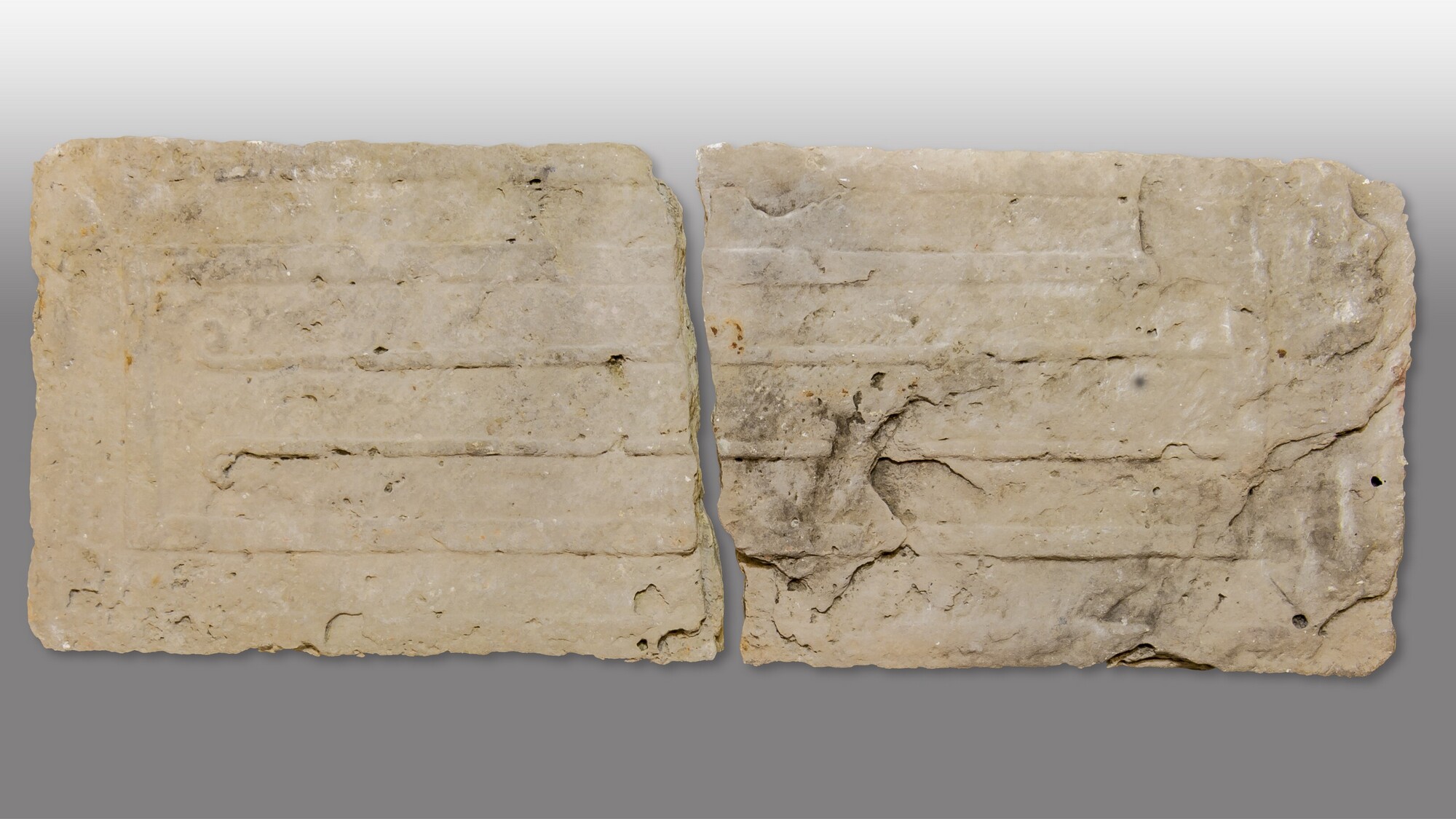 Sarcofaagdeksel; breed hoofdeinde en uitlopend in een iets smaller voeteinde; ingekapte zijkantversiering; versiering van twee kromstaven, binnen rechthoekig kader; in twee stukken gebroken