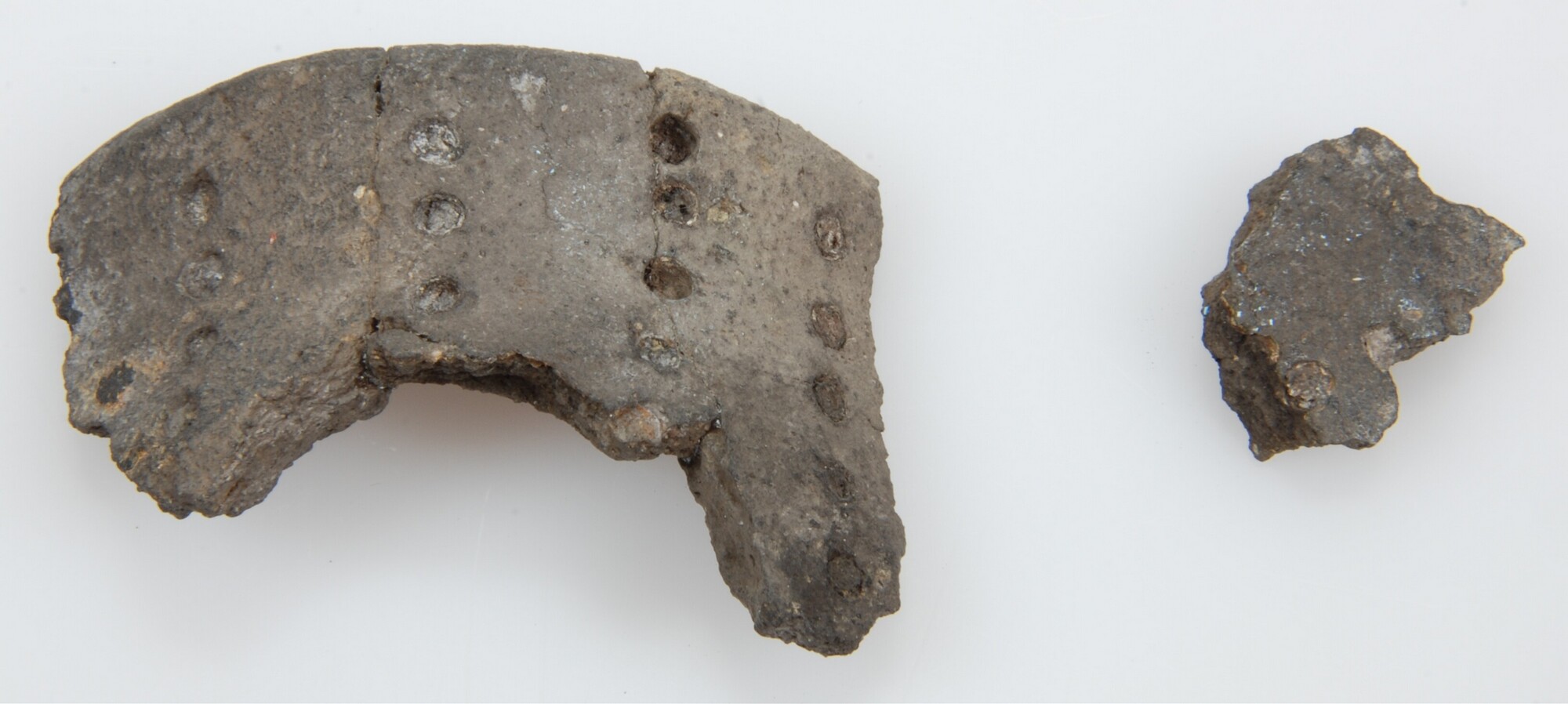 Randfragment pot en los bijbehorend fragment met vier rijen verticale puntversieringen; vermoedelijk klokbekertraditie; steengruismagering