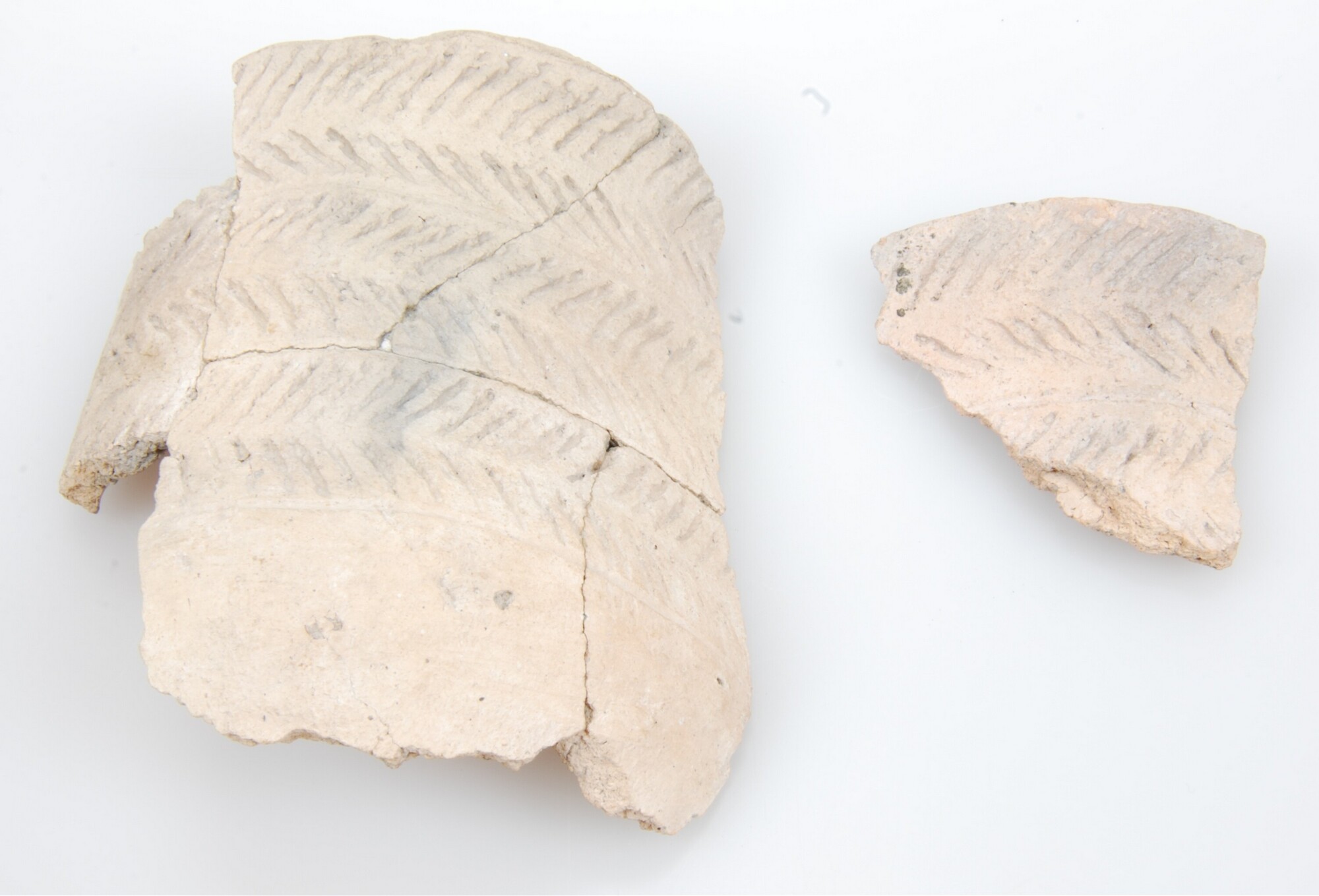 Standvoetbeker; twee fragmenten met touw- en visgraatversiering; mogelijk behoort het kleinere fragment bij het grotere fragment; steengruismagering