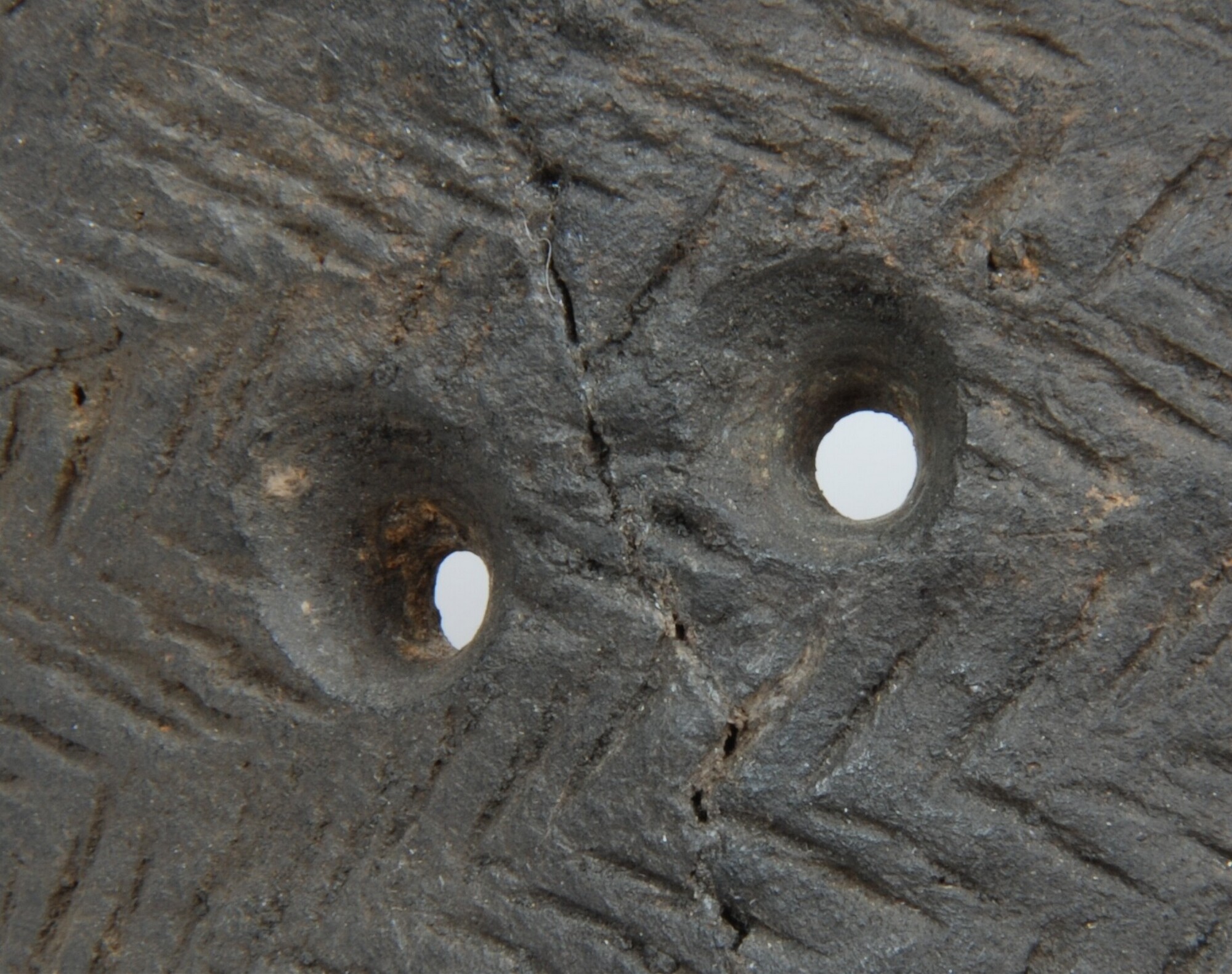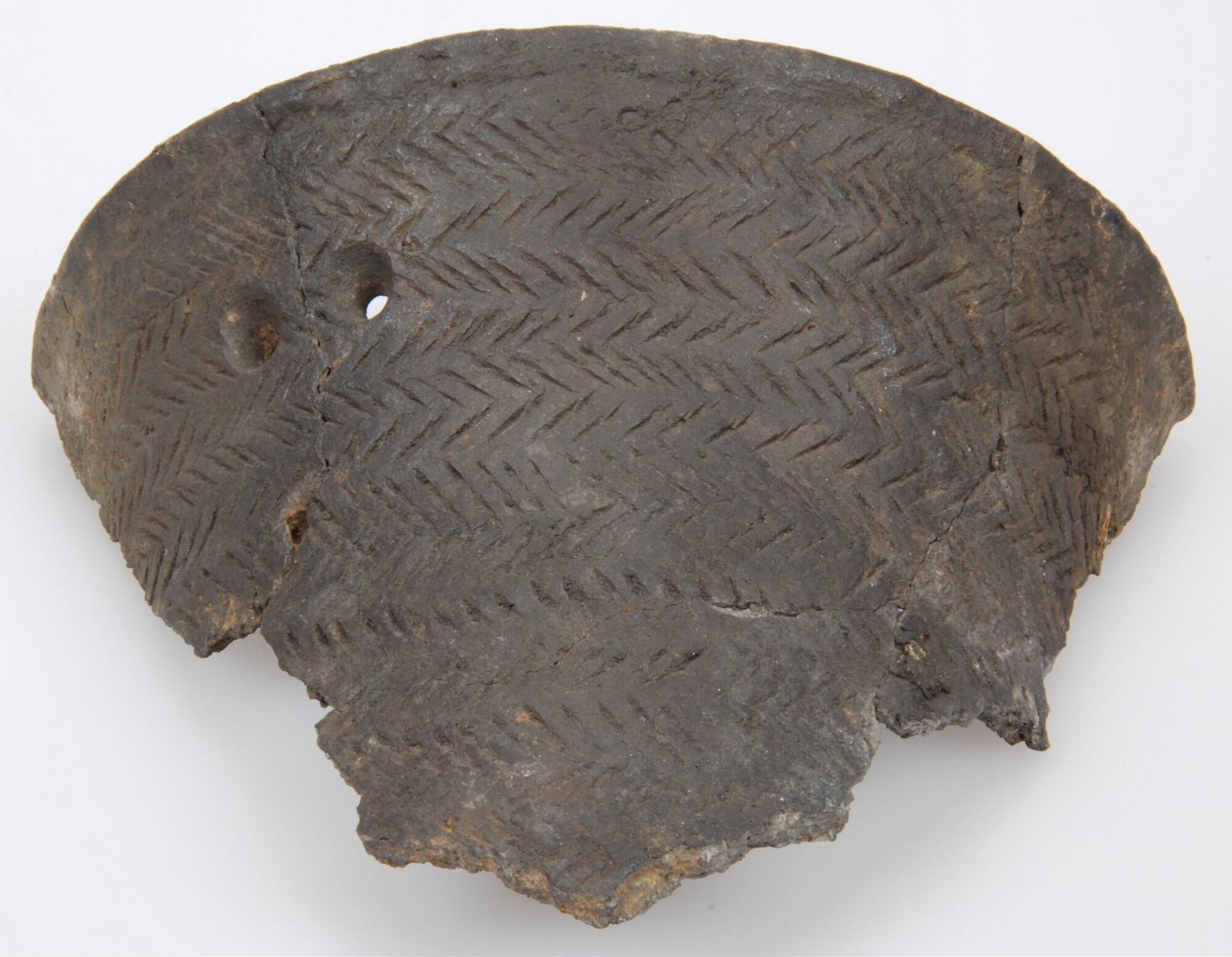 Standvoetbeker; randfragment met visgraatmotiefversiering in een aantal rijen boven elkaar; net onder de rand bevinden zich twee reparatiegaten; verkoolde resten aan de binnenrand; steengruismagering