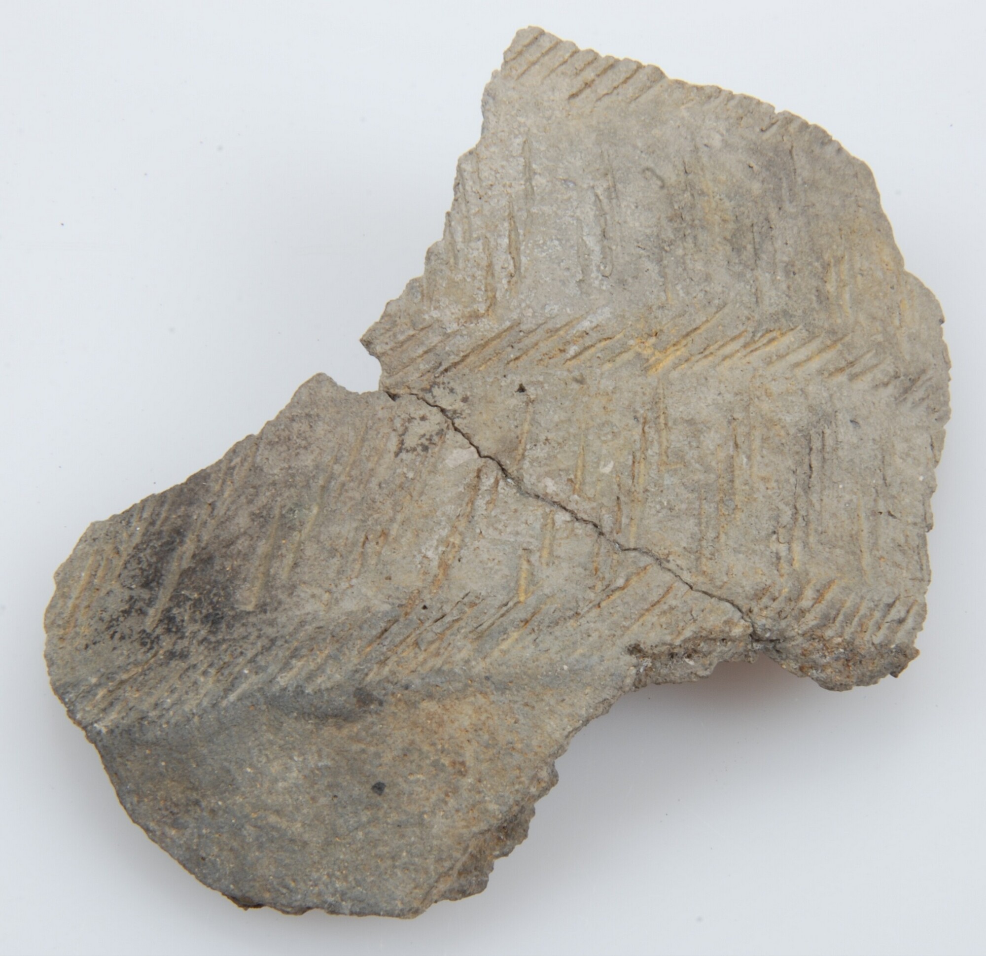 Standvoetbeker; wandfragment met twee rijen verticale lijnversieringen en drie rijen visgraatmotiefversieringen; steengruismagering