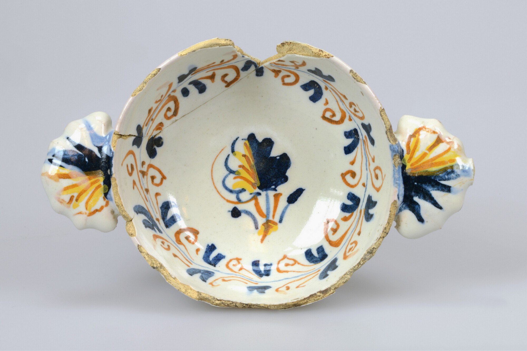 Kom; i-kom-2; afgeronde kom met rechte rand, standring, twee horizontale vormoren; Italiaans tinglazuuraardewerk (faience; Compendiario); in-en uitwendig tinglazuur; beschildering in blauw, oranje en geel: inwendig: bloem en aigretterand; herkomst: Ligurië, Italië