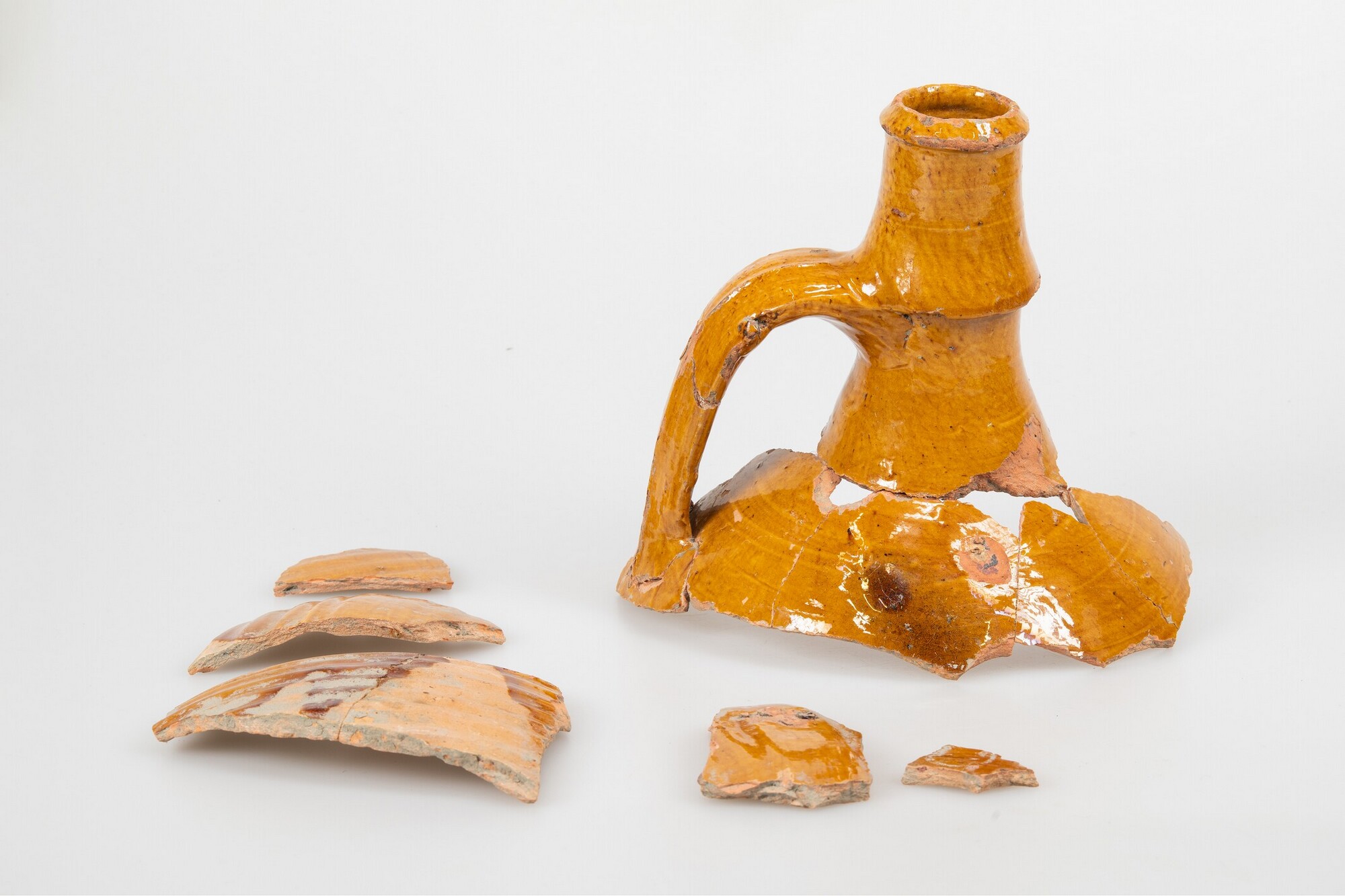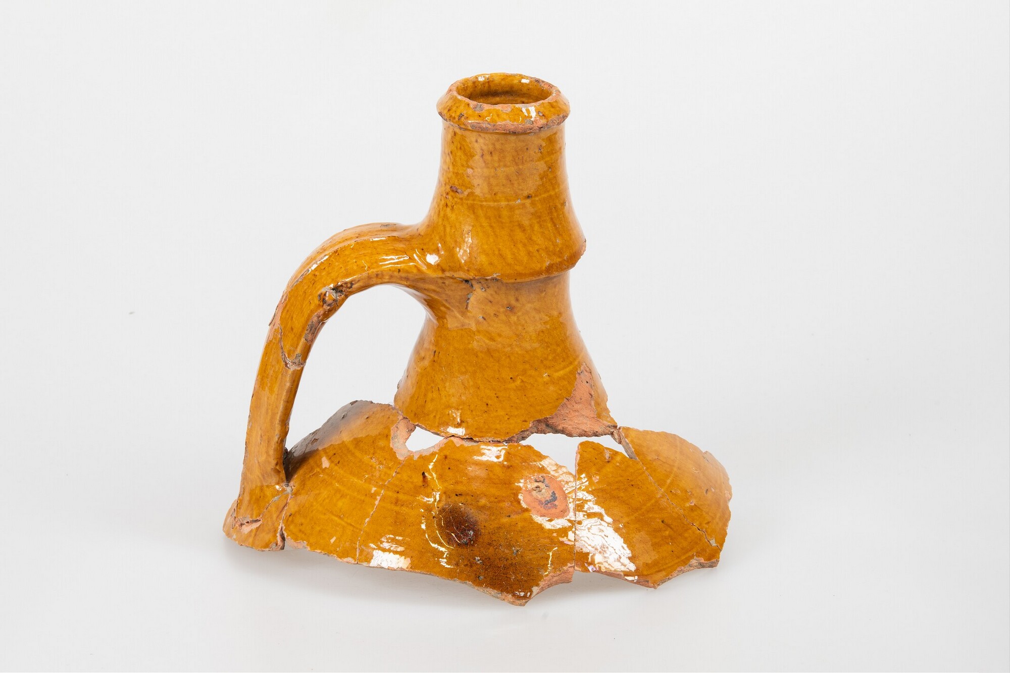 Kruik (fragmenten); ib-kru-; bolle kruik met smalle taps toelopende hals en manchetrand, verticaal lintoor; Mediterraan roodbakkend aardewerk; uitwendig loodglazuur; herkomst: Iberisch Schiereiland