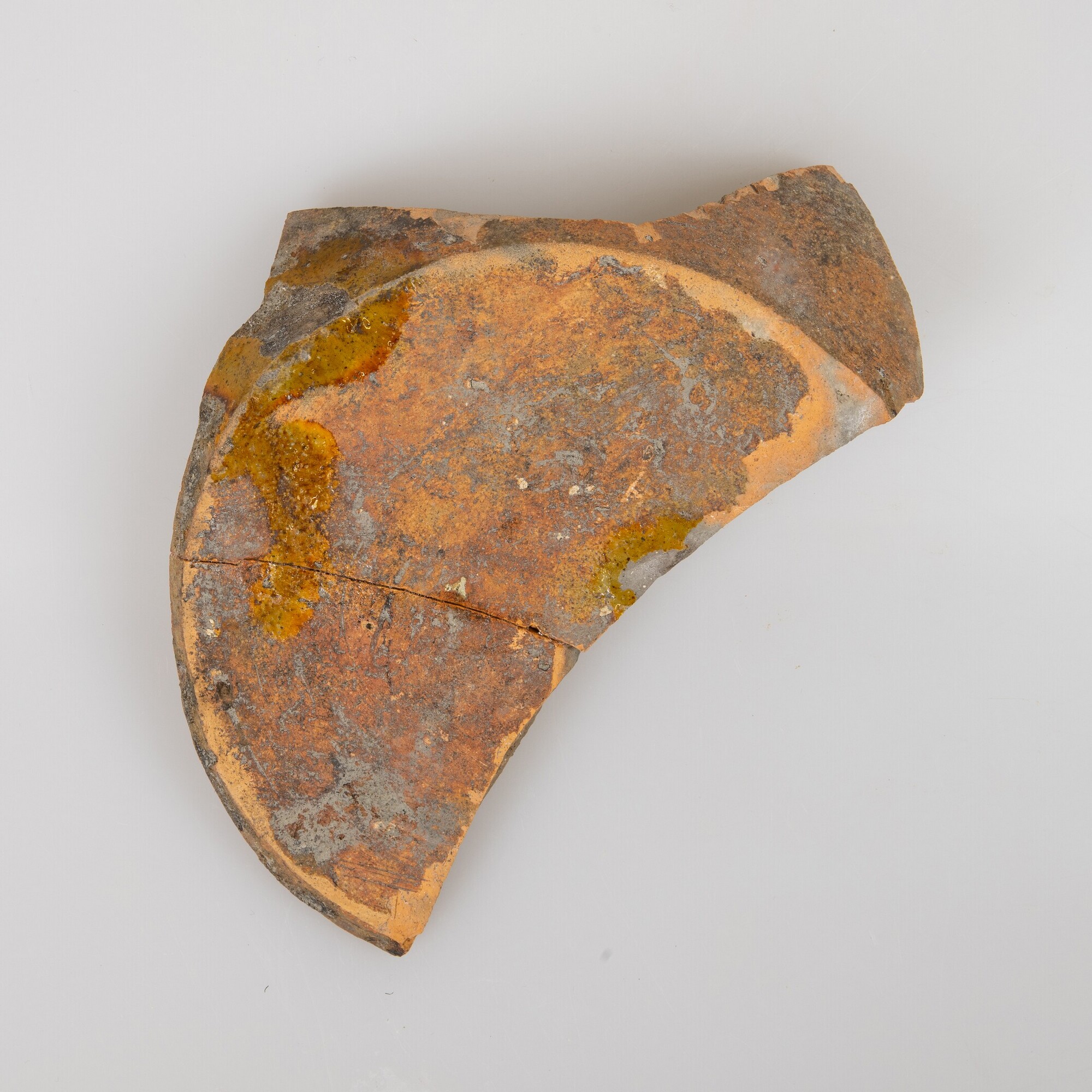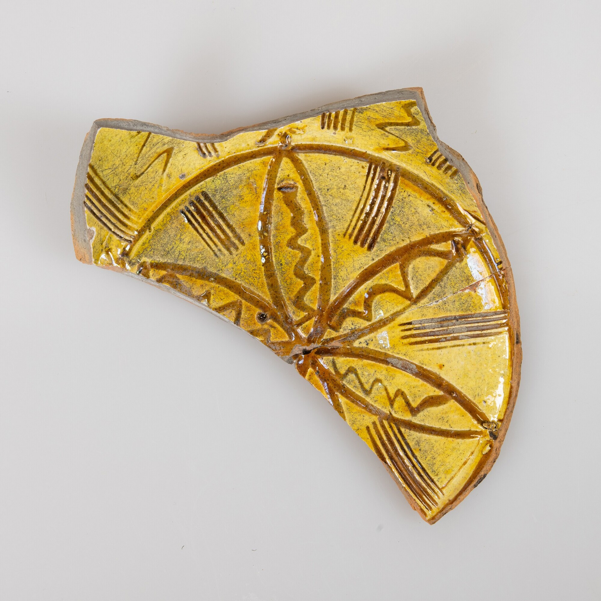 Bord (bodemfragment); r-bor-; standvlak; roodbakkend aardewerk; inwendig loodglazuur; inwendig witte kleisliblaag met sgraffito-versiering van bloem op spiegel en verticale streepjes en slingerlijnen op vlag; herkomst: North-Devon, Engeland