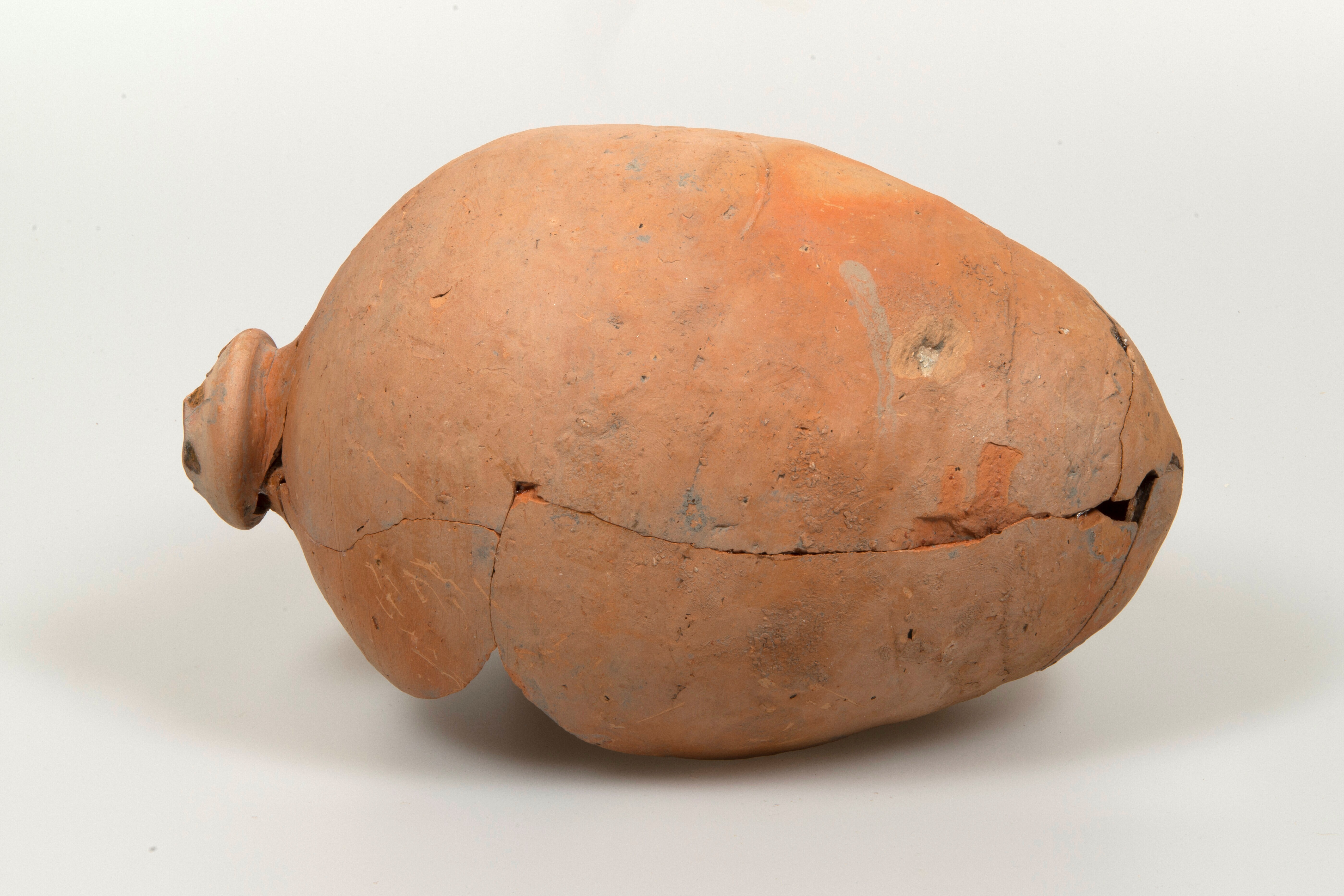 Kruik; ib-kru-2; hoge amfoor met smalle opening, kraagrand, lensvormige bodem; Iberisch roodbakkend aardewerk (Merida ware); herkomst: Portugal (1 zakje met bijbehorende fragmenten)