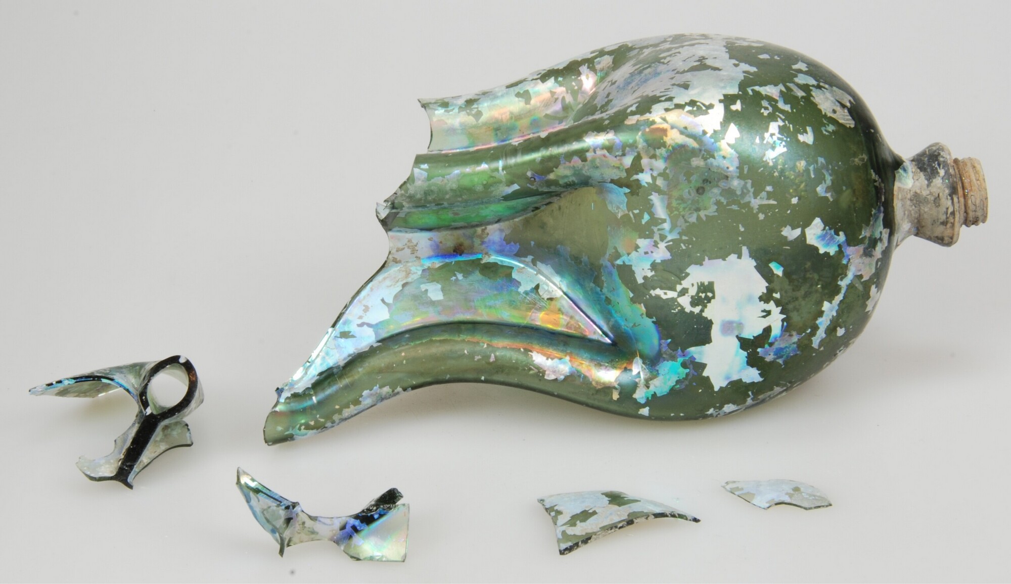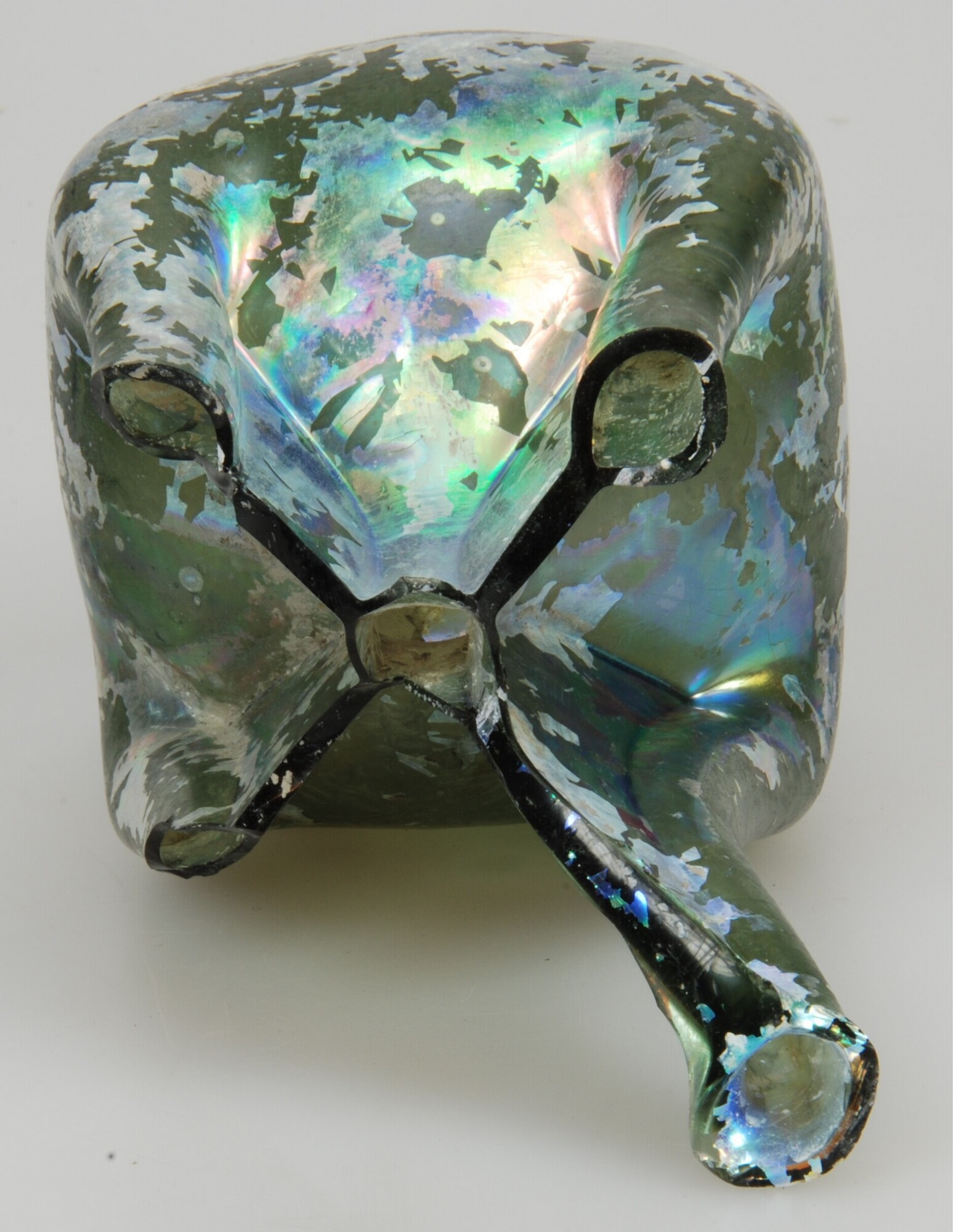 Kelderfles; gl-fle-129; hoge kuttrolf bestaande uit twee delen die in het midden versmald overgaan in vijf verticale buizen, licht opgestoken bodem met pontilmerk; groen glas; kraag van loden schroefdop aanwezig; herkomst: Duitsland of Nederlanden; datum: 22-2-2007; vak 8; aanleg vlak
