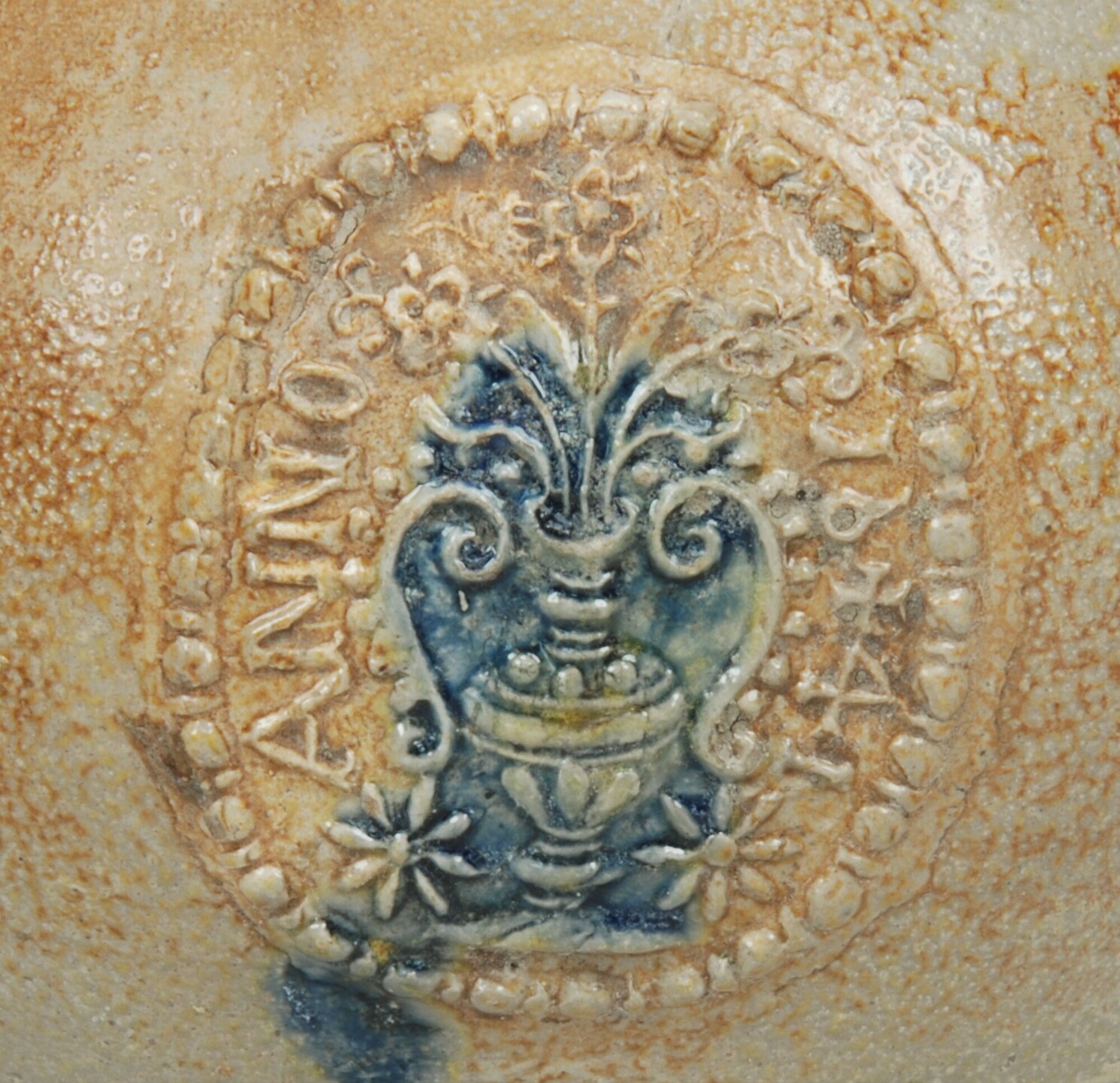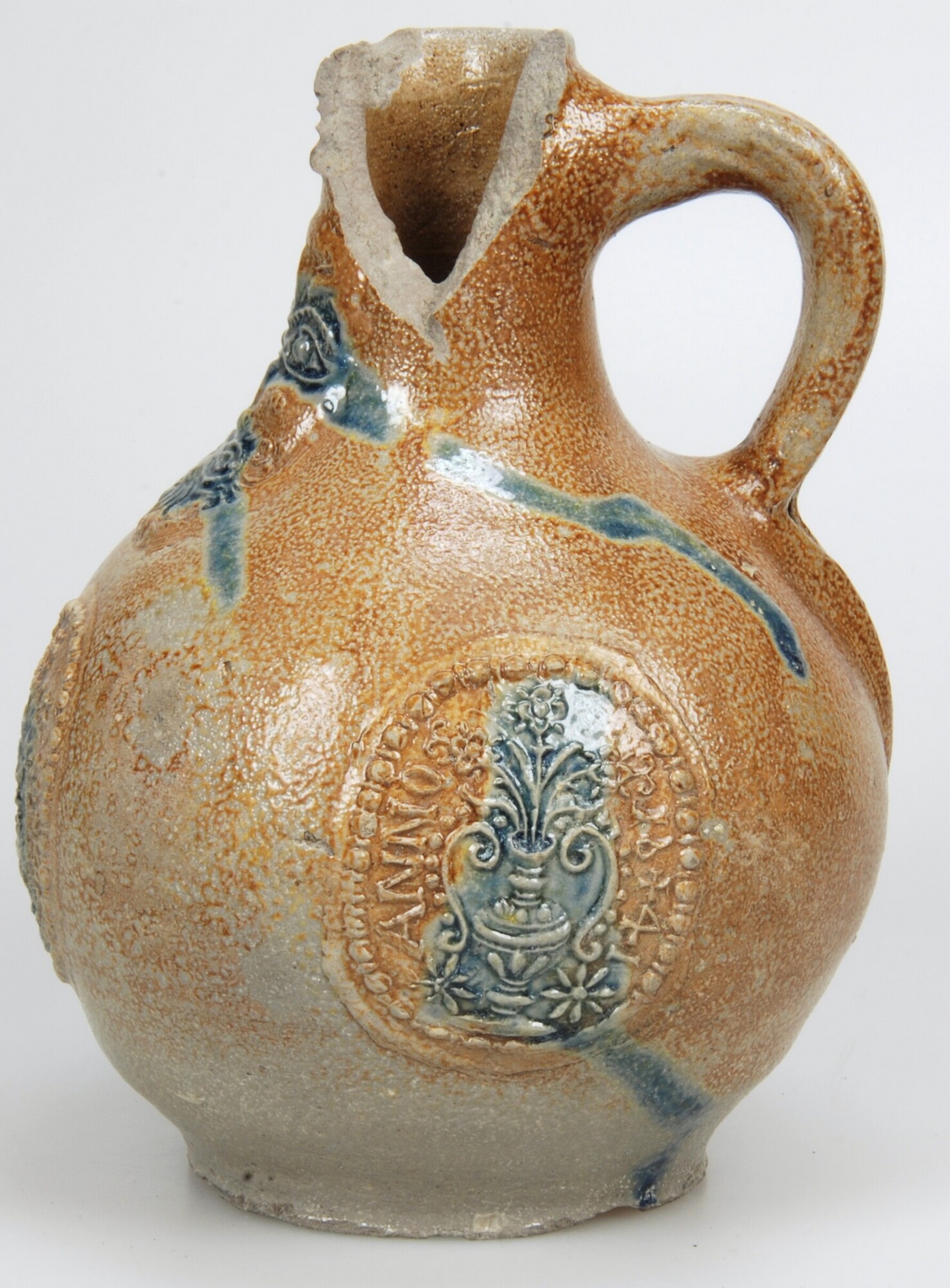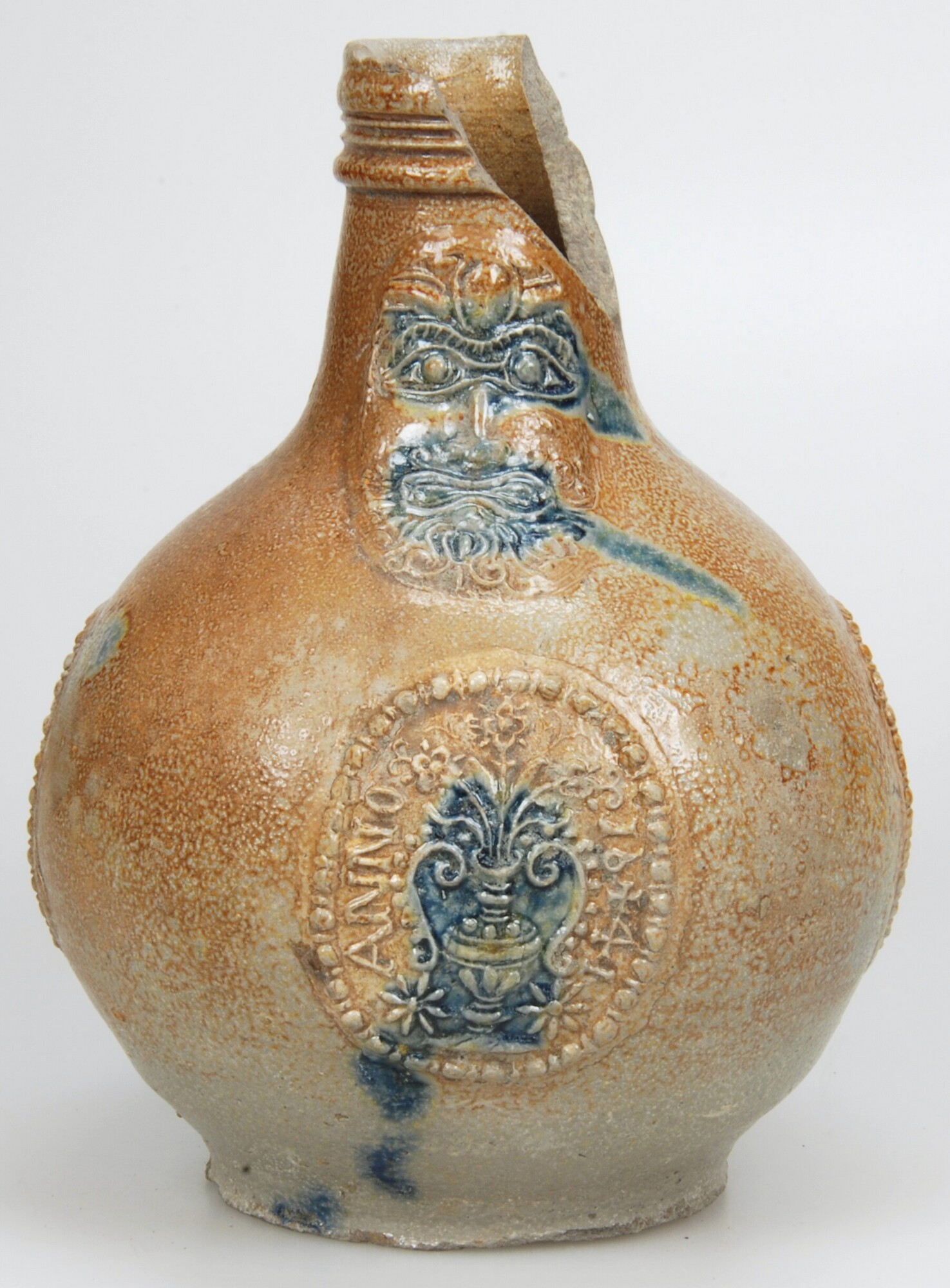 Baardmankruik; s2-kan-32; bolle kan met schouder overgaand in hoge hals met geribbelde kraagrand, standvlak, verticaal lintoor; steengoed met oppervlaktebehandeling: ijzerengobe en accenten van kobaltoxide, zoutglazuur; appliques: baardman op hals en drie medaillons met een bloemenvaas en de tekst "ANNO 1641" op buik; herkomst: Frechen, Duitsland