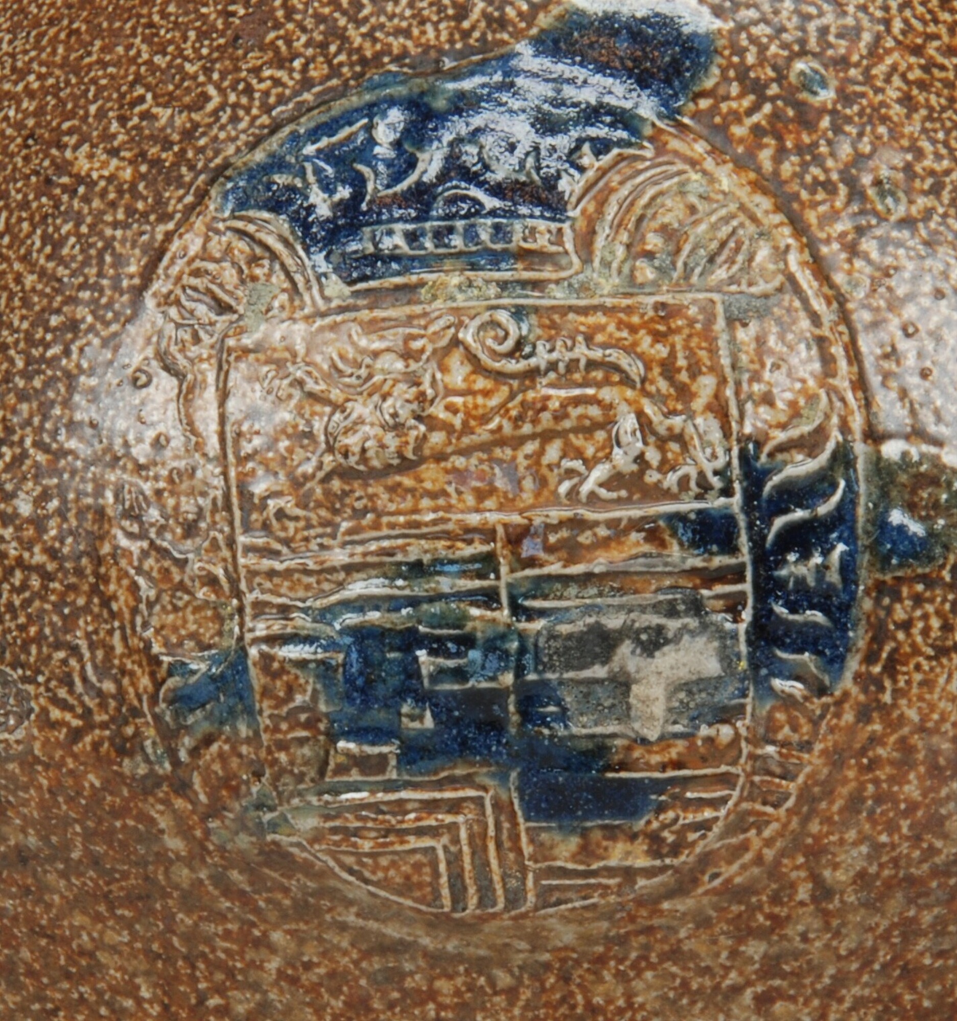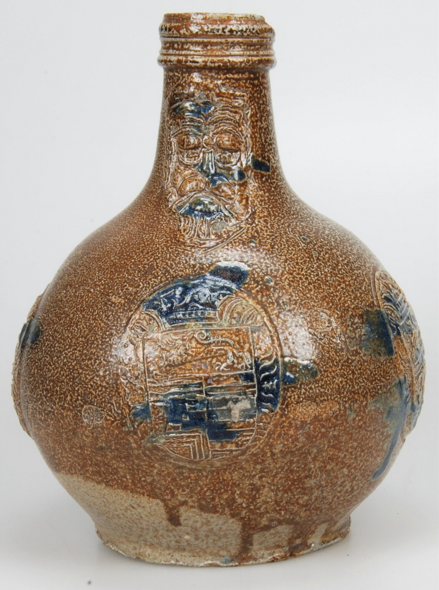 Baardmankruik; s2-kan-32; bolle kan met schouder overgaand in hoge hals met geribbelde kraagrand, standvlak, verticaal lintoor; steengoed met oppervlaktebehandeling: ijzerengobe en accenten van kobaltoxide, zoutglazuur; appliques: baardman op hals en drie medaillons met gekroonde wapenschilden op buik: leeuw en vlakken met horzintale banden,wapen lijkt deels op dat van Julich-Cleve-Berg; herkomst: Frechen, Duitsland; datum: 14-12-2006; vak ...