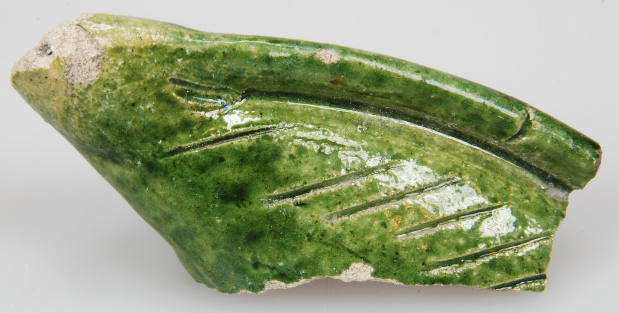 Spaarpot (fragment); wi-spa-1; spaarvarken; witbakkend aardewerk; loodglazuur met koperoxide; gekerfde diagonale strepen op lichaam; herkomst: Nederland; datum: 12-14-2006; vondstomstandigheden: verdiepen vlak