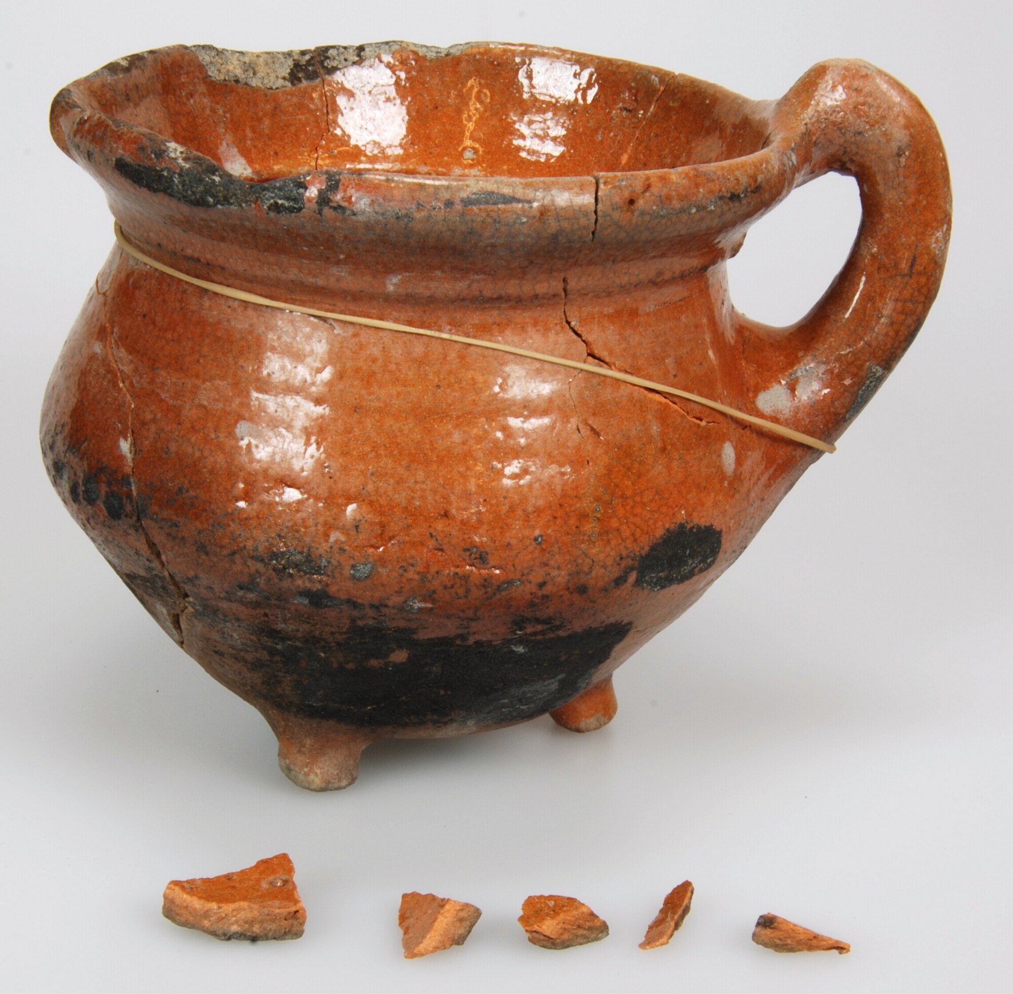 Grape; r-gra-11; bolle grape met uitgebogen rand, ribbel op de randaanzet en met verdikte afgeronde lip, driepoot, verticaal worstoor; roodbakkend aardewerk; loodglazuur; herkomst: Bergen op Zoom; datum: 15-11-2006; vak 11; vondstomstandigheden: verdiepen vlak tot 1,75m diepte