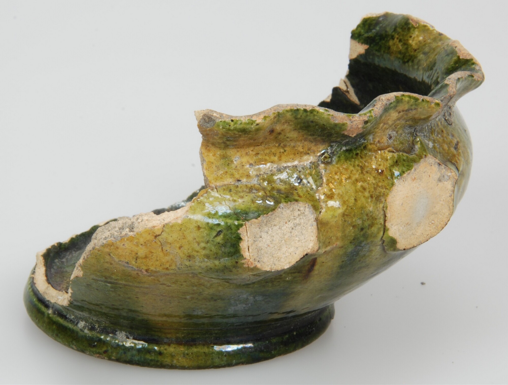 Kom; w-kom- (archeologisch compleet); kom met afgeronde buikknik en naar buiten geknikte en gegolfde rand, standvlak; witbakkend aardewerk; loodglazuur met koperoxide; op buik aanzet voor horizontaal worstoor; datum: 15-12-2006; vak 4; vondstomstandigheden: verdiepen vlak tot 1,75m