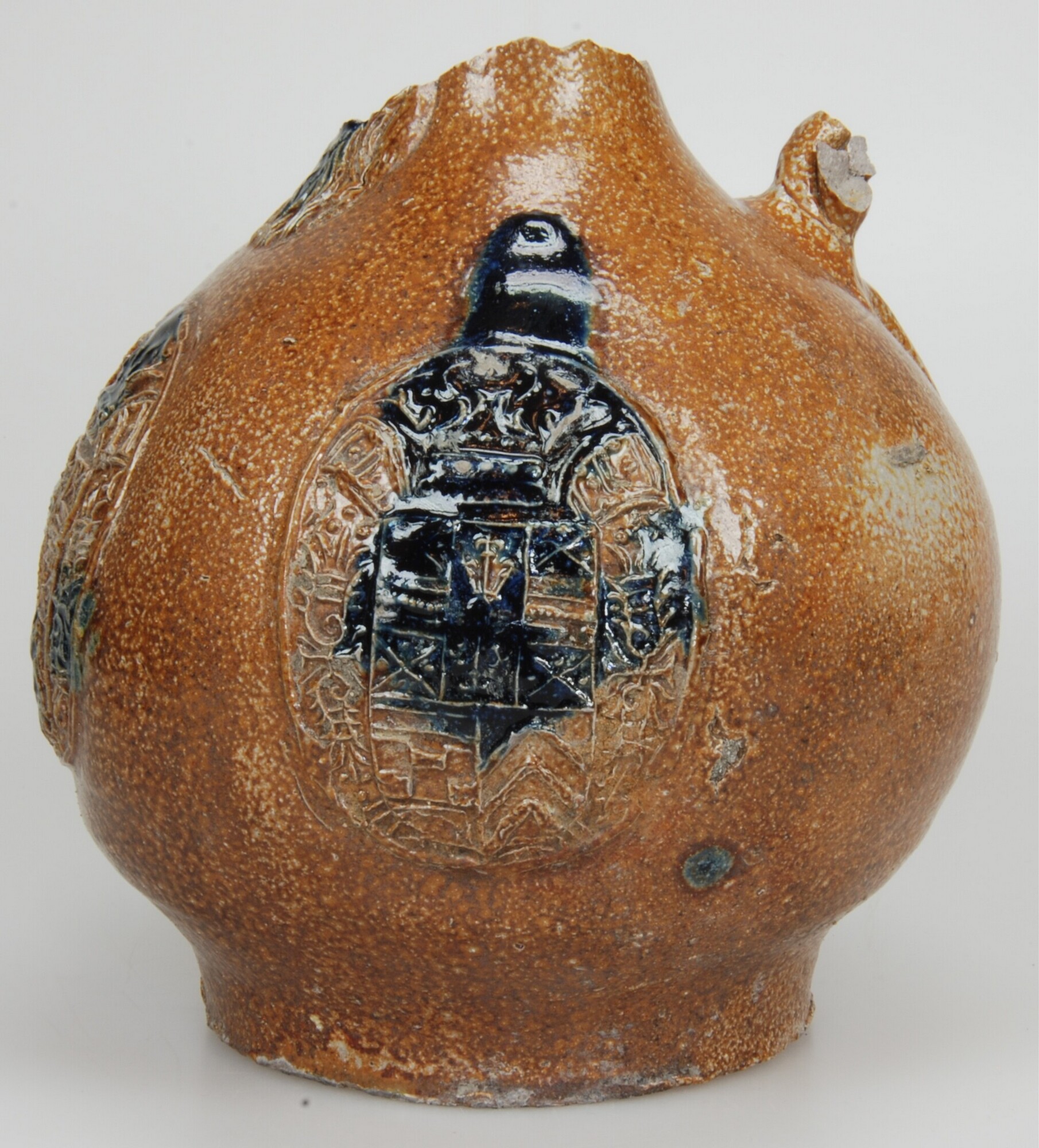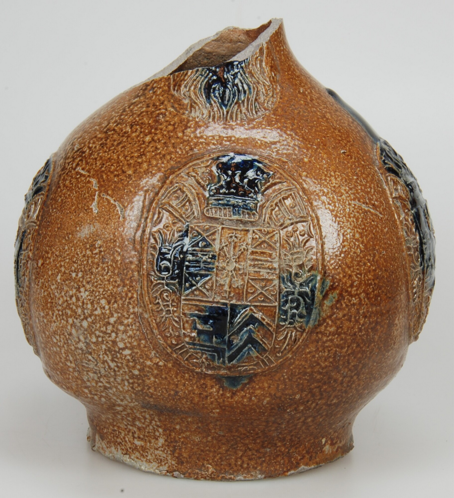 Baardmankruik; s2-kan-32; bolle kan met schouder overgaand in hoge hals, standvlak, lintoor (ontbreekt); steengoed met oppervlaktebehandeling: ijzerengobe en accenten van kobaltoxide, zoutglazuur; appliques: baardman op hals en drie medaillons op buik met gekroond wapenschild: lijkt op wapen van Gulik-Kleef-Berg; herkomst: Frechen, Duitsland; datum: 15-01-2007
