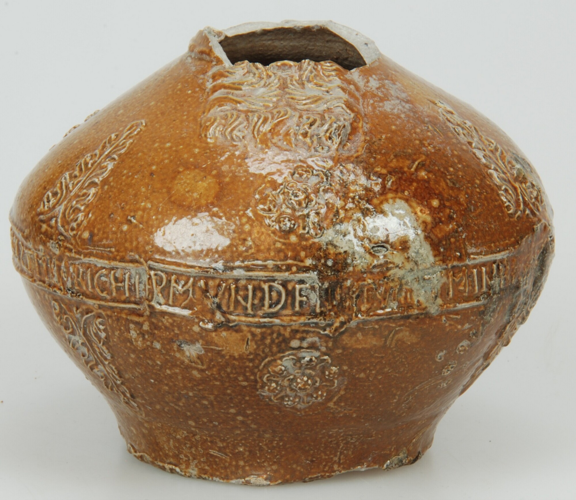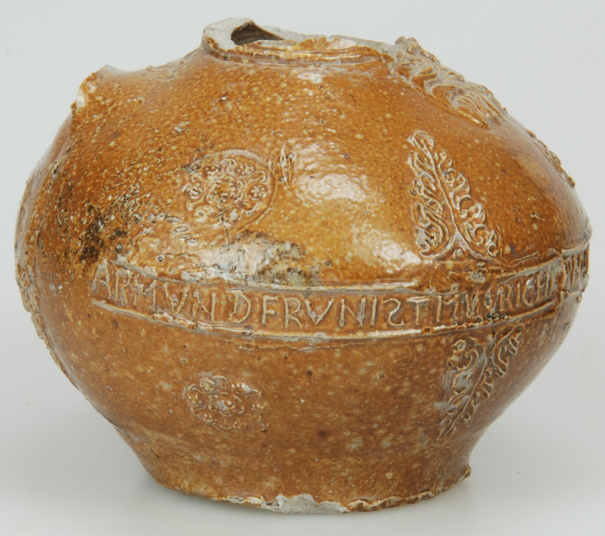 Baardmankruik; s2-kan-; bolle kan met afgeronde buikknik, standvoet, verticaal lintoor (ontbreekt); steengoed met oppervlaktebehandeling: ijzerengobe, zoutglazuur; appliques: baardman op hals, tekstband omgeven door accanthusbladeren en bloem-appliques op buik; tekst:: ARMVNDFRVNISTMINRICHI; herkomst: Frechen, Duitsland; datum: 15-01-2007