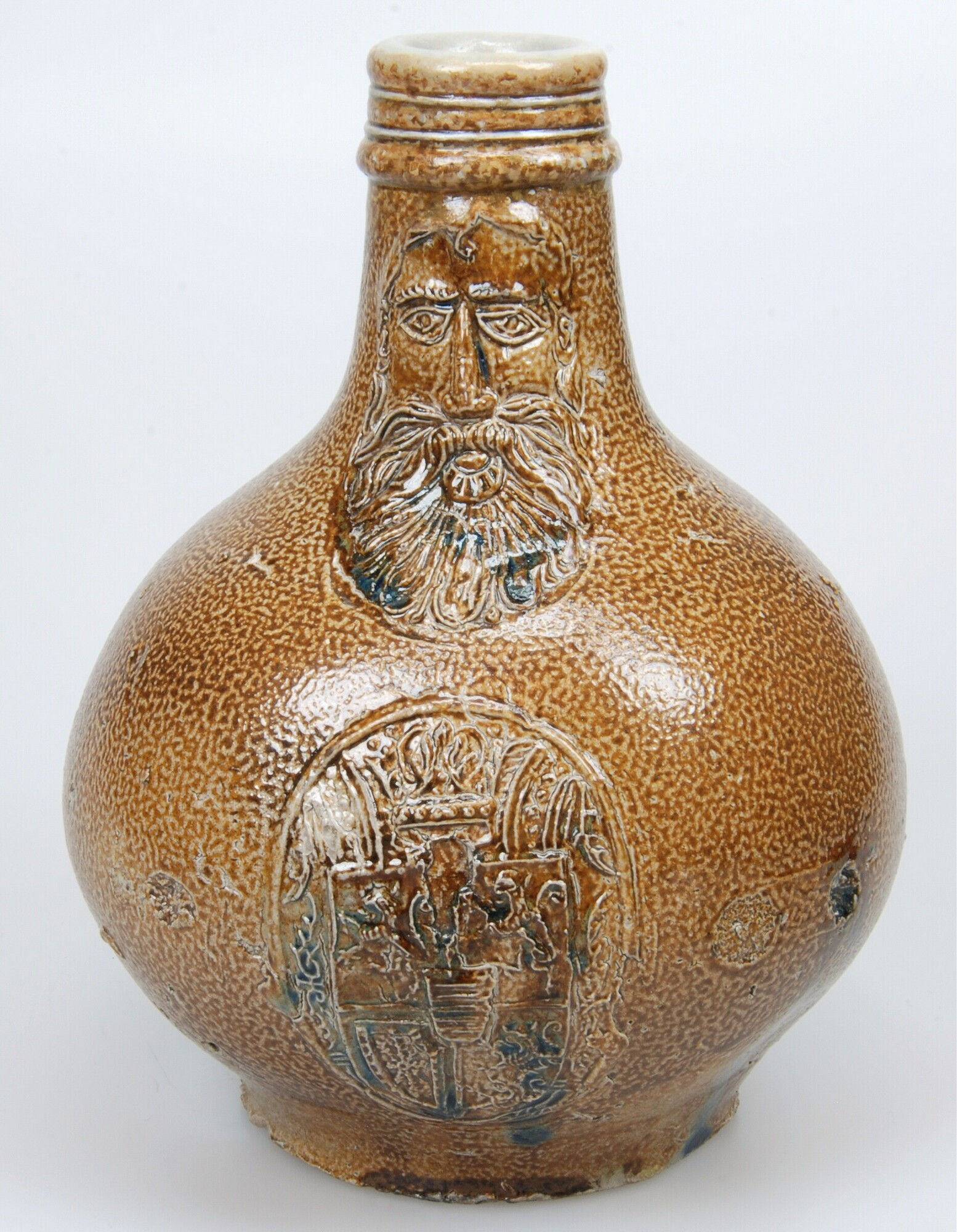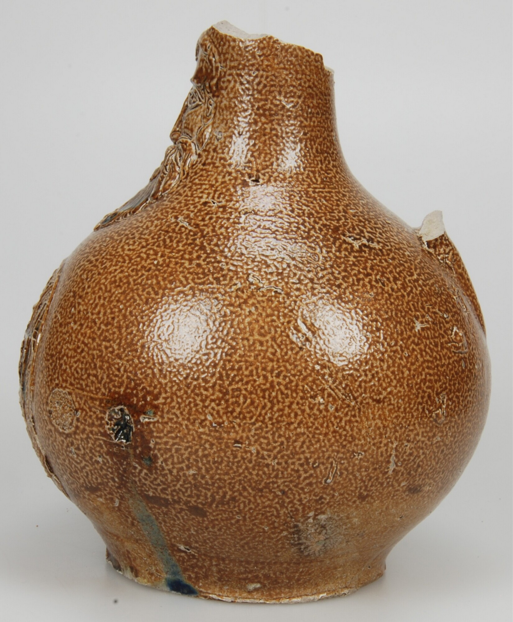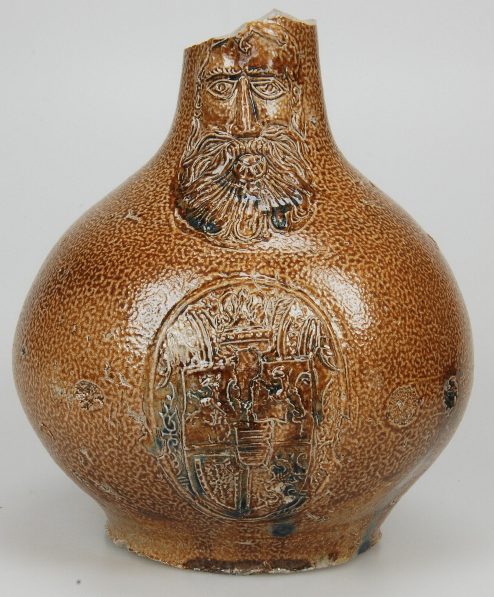 Baardmankruik; s2-kan-32; bolle kan met schouder overgaand in hoge hals met geribbelde kraagrand, standvlak, verticaal lintoor (ontbreekt); steengoed met oppervlaktebehandeling: ijzerengobe, zoutglazuur met accenten van kobaltoxide; appliques: baardman op hals en op buik drie medaillons met gekroond wapenschild: vier vlakken met leeuwen en centraal een schildje met horizontale strepen; herkomst: Frechen, Duitsland