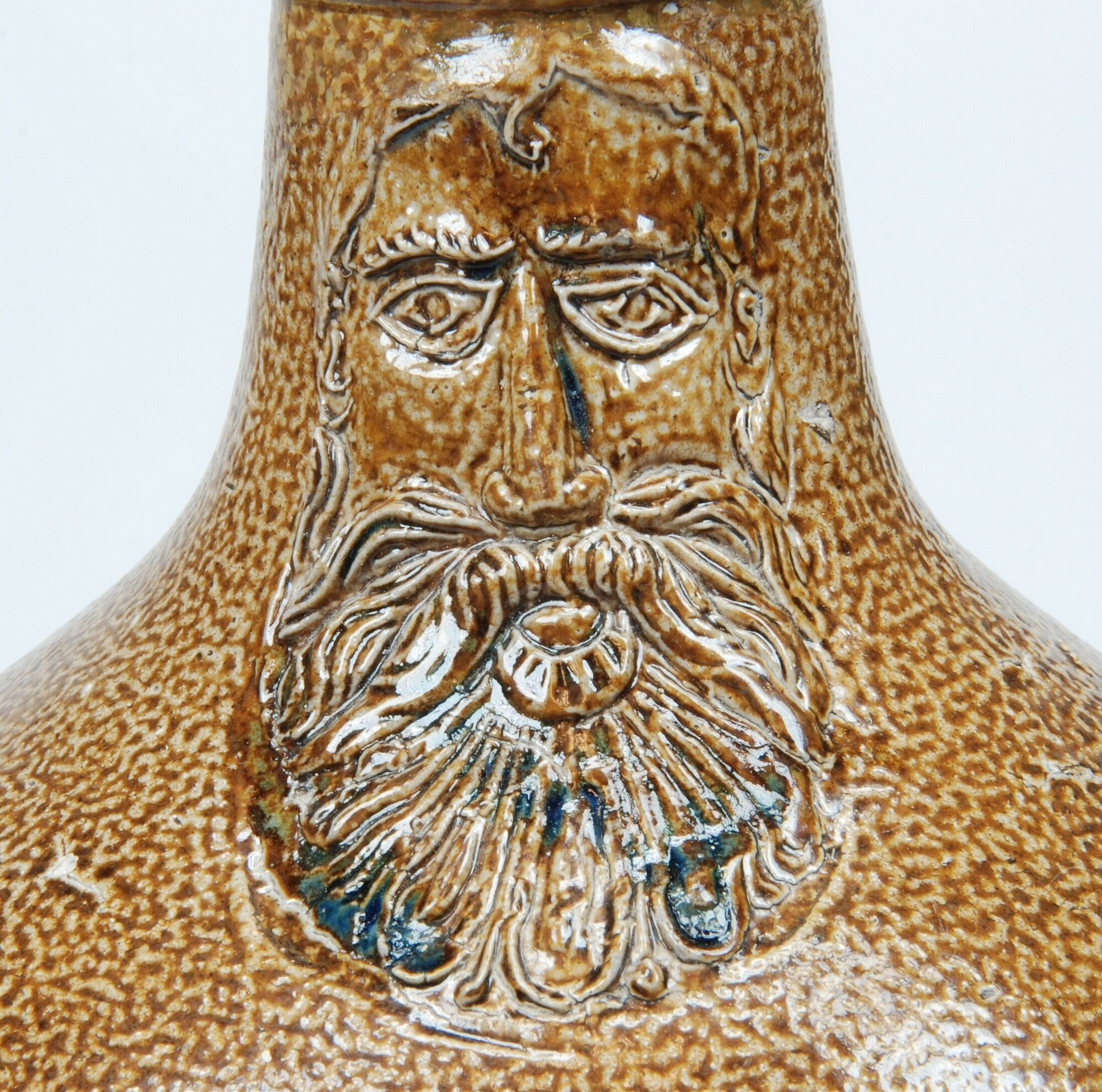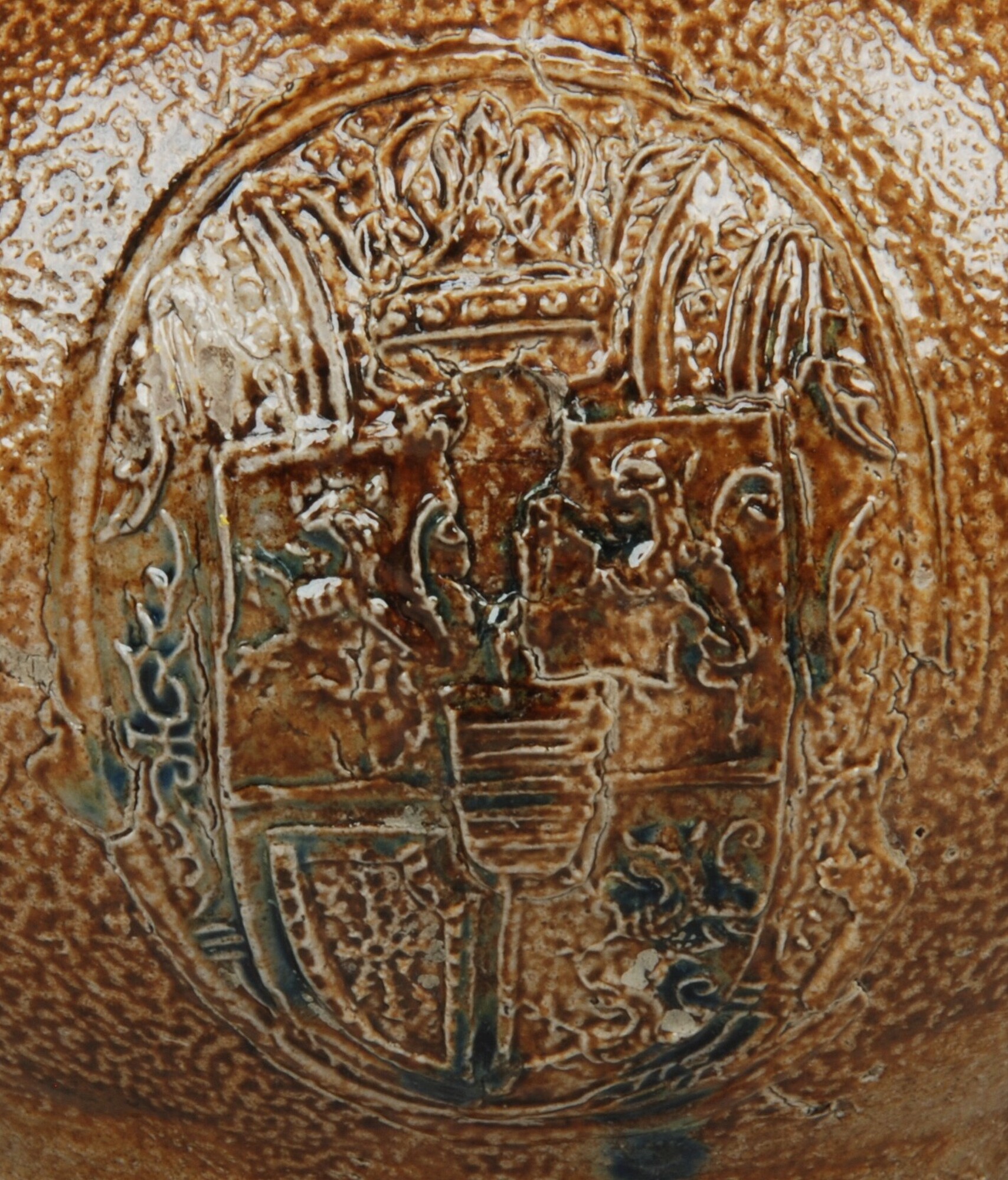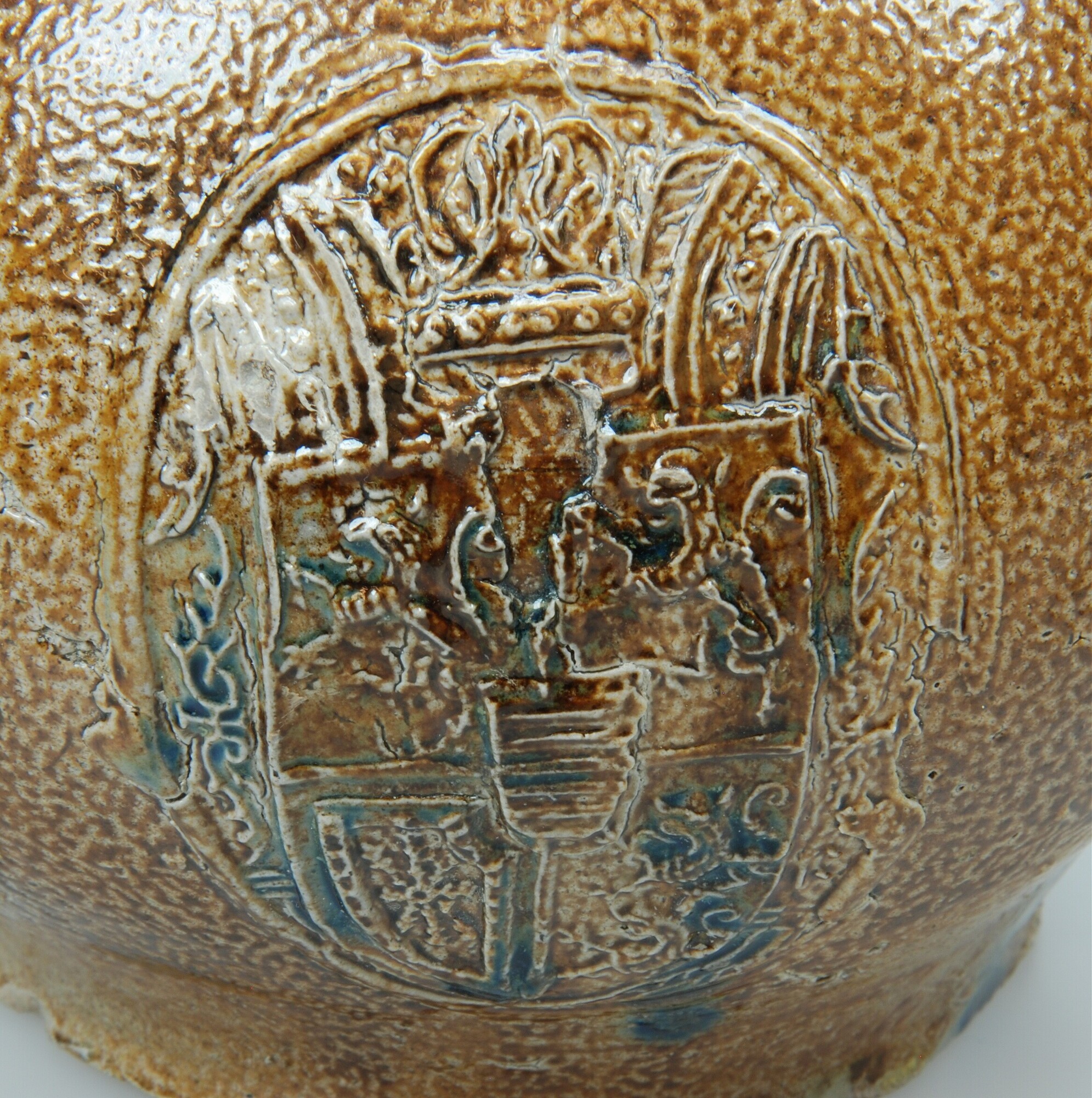 Baardmankruik; s2-kan-32; bolle kan met schouder overgaand in hoge hals met geribbelde kraagrand, standvlak, verticaal lintoor (ontbreekt); steengoed met oppervlaktebehandeling: ijzerengobe, zoutglazuur met accenten van kobaltoxide; appliques: baardman op hals en op buik drie medaillons met gekroond wapenschild: vier vlakken met leeuwen en centraal een schildje met horizontale strepen; herkomst: Frechen, Duitsland