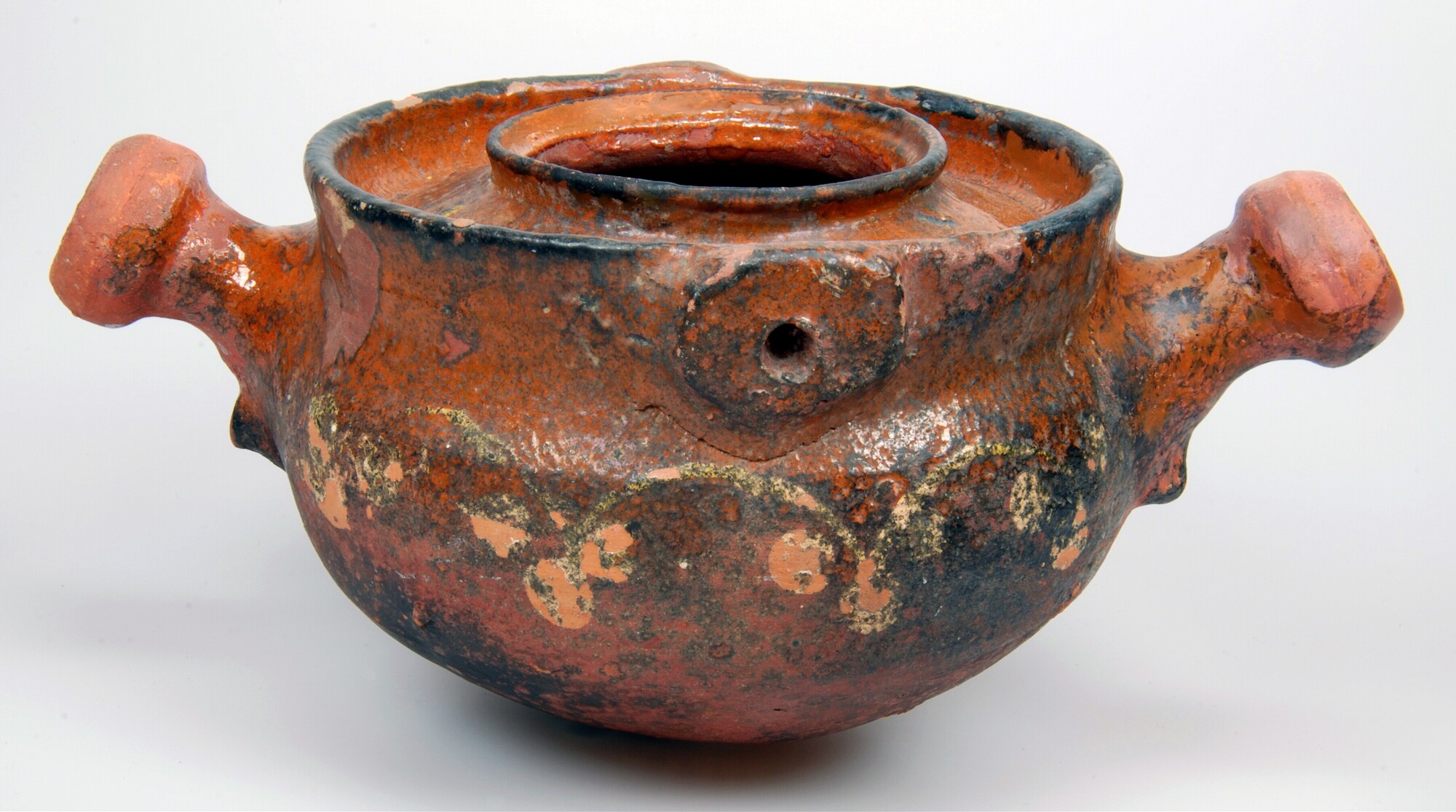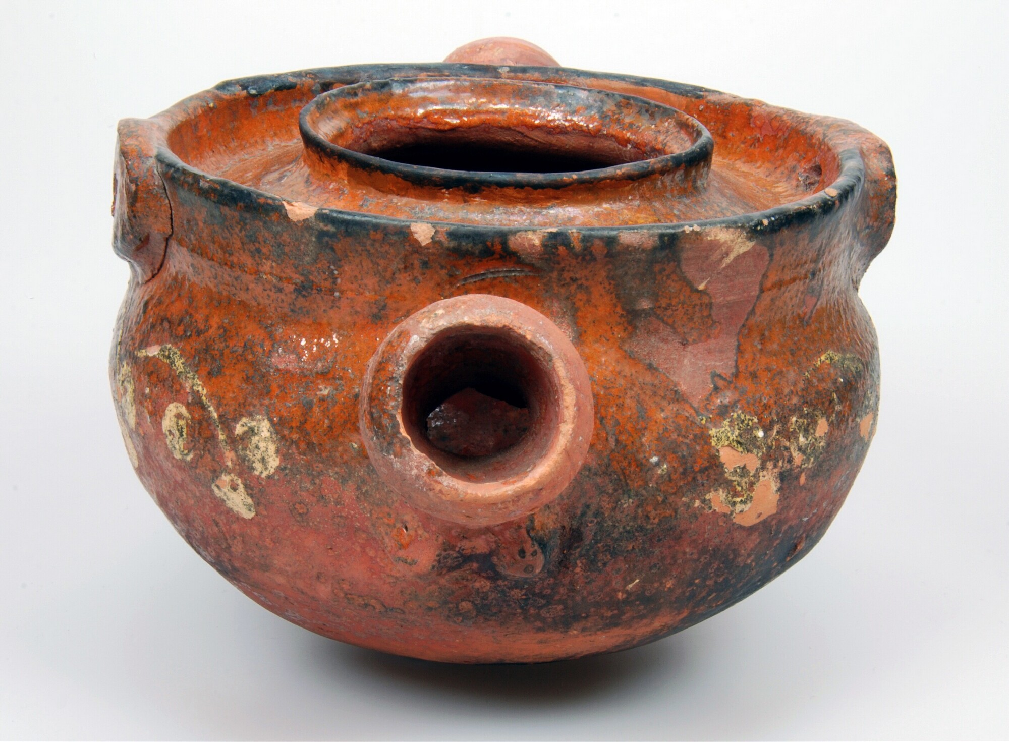 Lavabo; r-lav-; bolle lavabo met opstaande richel vanuit de schouder en kraagrand met dekselgeul, twee ophangogen en twee ronde tuiten met verdikte rand; roodbakkend aardewerk; loodglazuur; slibversiering: doorlopende boogjes uitlopend op een omgekeerd klavermotief in witte kleislib; de tuiten met er vlak onder twee uitstulpingen zijn waarschijnlijk als fallus met ballen bedoeld; productieplaats: Utrecht (?)