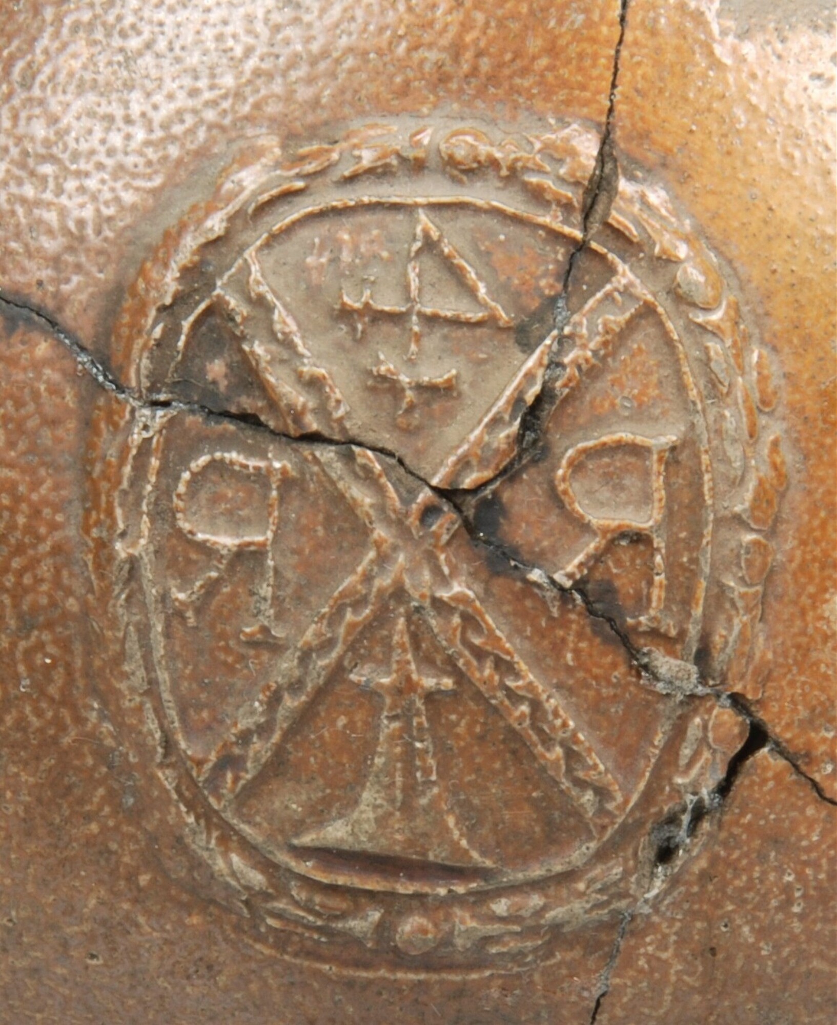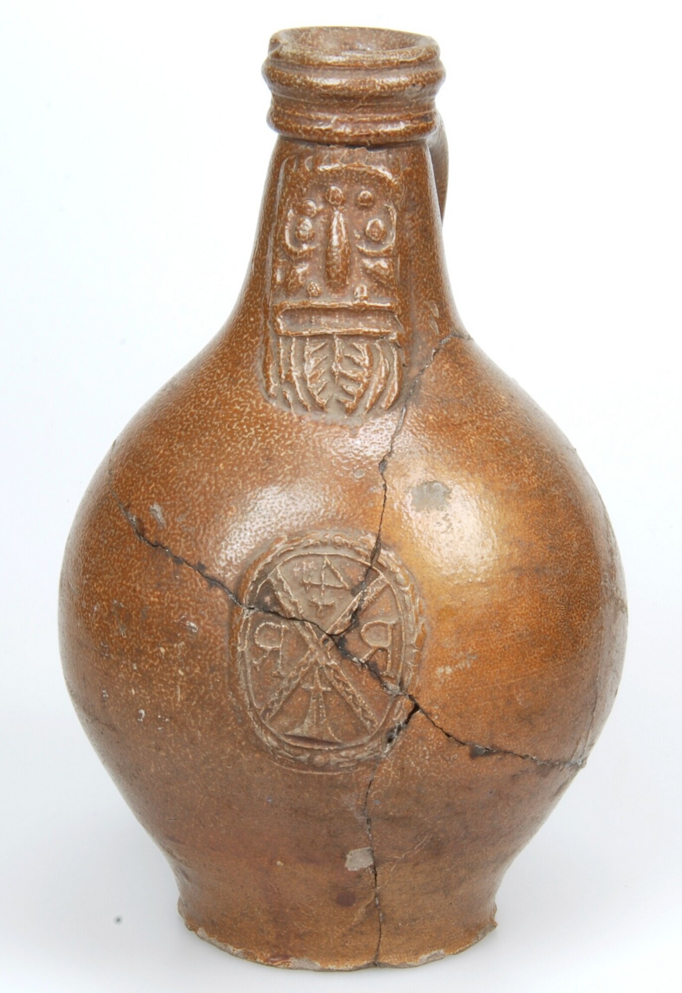 Baardmankruik; s2-kan-32; smalle hals; zoutglazuur en ijzerengobe; bandoor; ovoïde lichaam; afgesneden voet; gestileerd gezicht met gesloten mond, de baard is met lijnen weergegeven, op het lichaam van de kruik een andreaskruis met de letters E&R met een huismerk; productieplaats: Frechen.