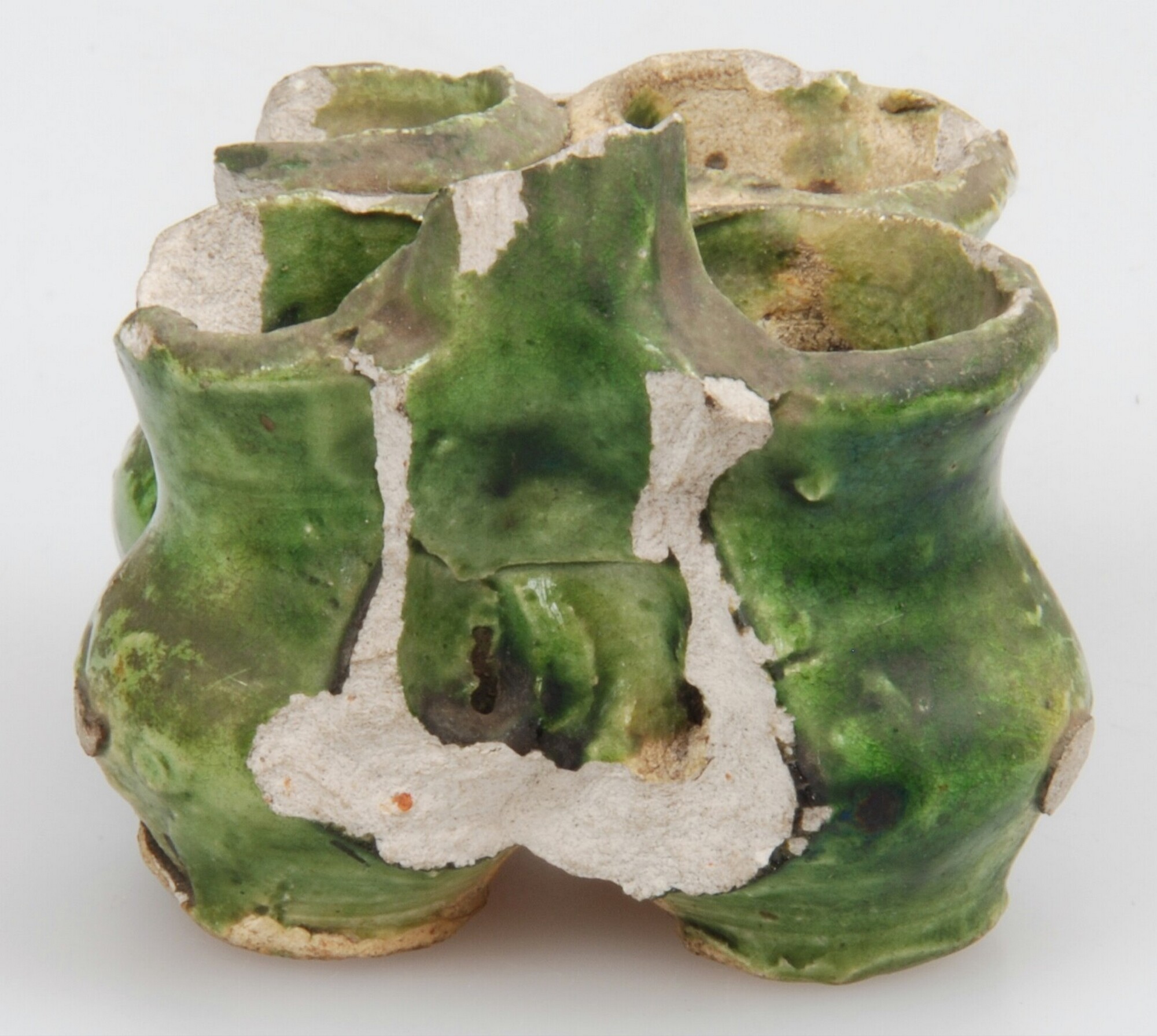 Tafelstel; vier bakjes; witbakkend; loodglazuur met koperoxide; lintoor ontbreekt; productiegebied: Rijnland