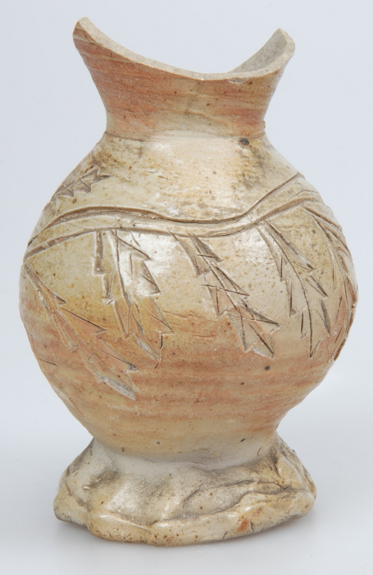 Trechterbeker; s2-tre-?; geknepen standring, lintoor (ontbreekt); steengoed met oppervlaktebehandeling: zoutglazuur, gekerfde bladranken op buik; herkomst: Siegburg, Rijnland