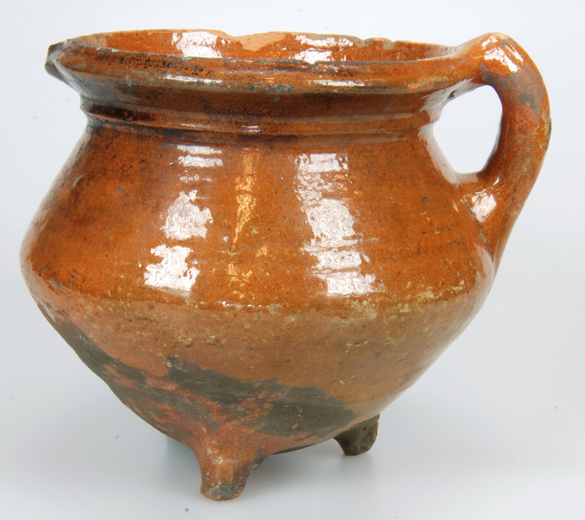 Grape; r-gra-11; bolle grape met uitgebogen rand met ribbel op randaanzet en met verdikte afgeronde lip; roodbakkend aardewerk; inwendig loodglazuur, uitwendig op rand en schouder; drie poten; één toegeknepen oor; schenklip; bodem licht beroet; herkomst: Bergen op Zoom