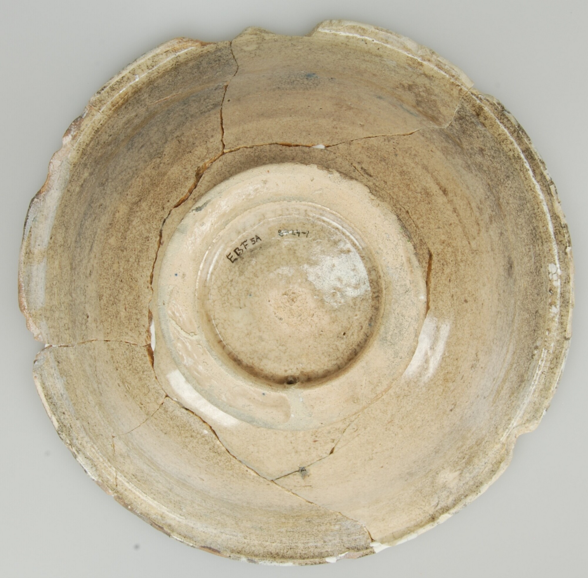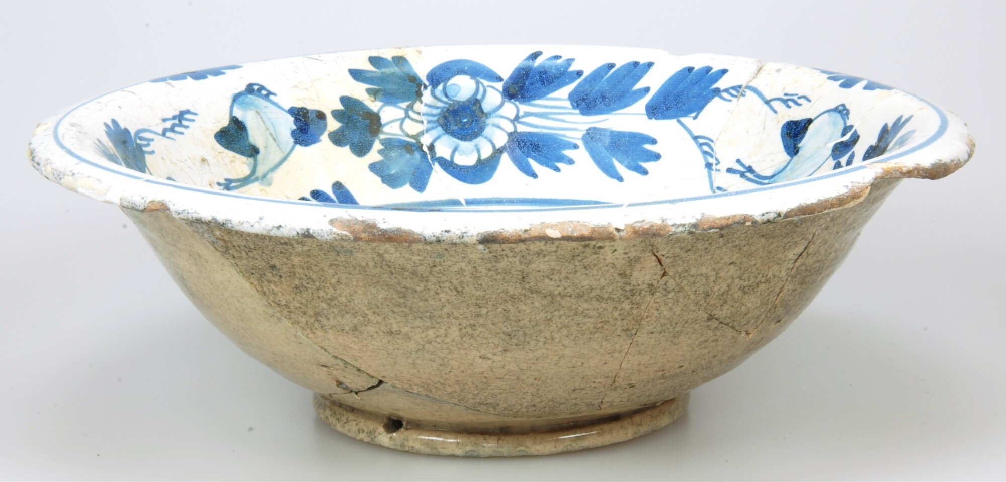 Kom; m-kom-6; kom met uigebogen rand; Nederlandse majolica; inwendig tinglazuur, uitwendig loodglazuur; blauwe beschildering; inwendig: bloemen; standring; herkomst: Friesland(?)