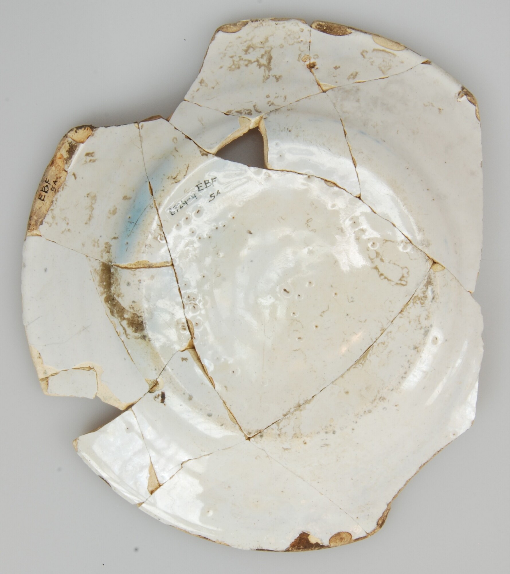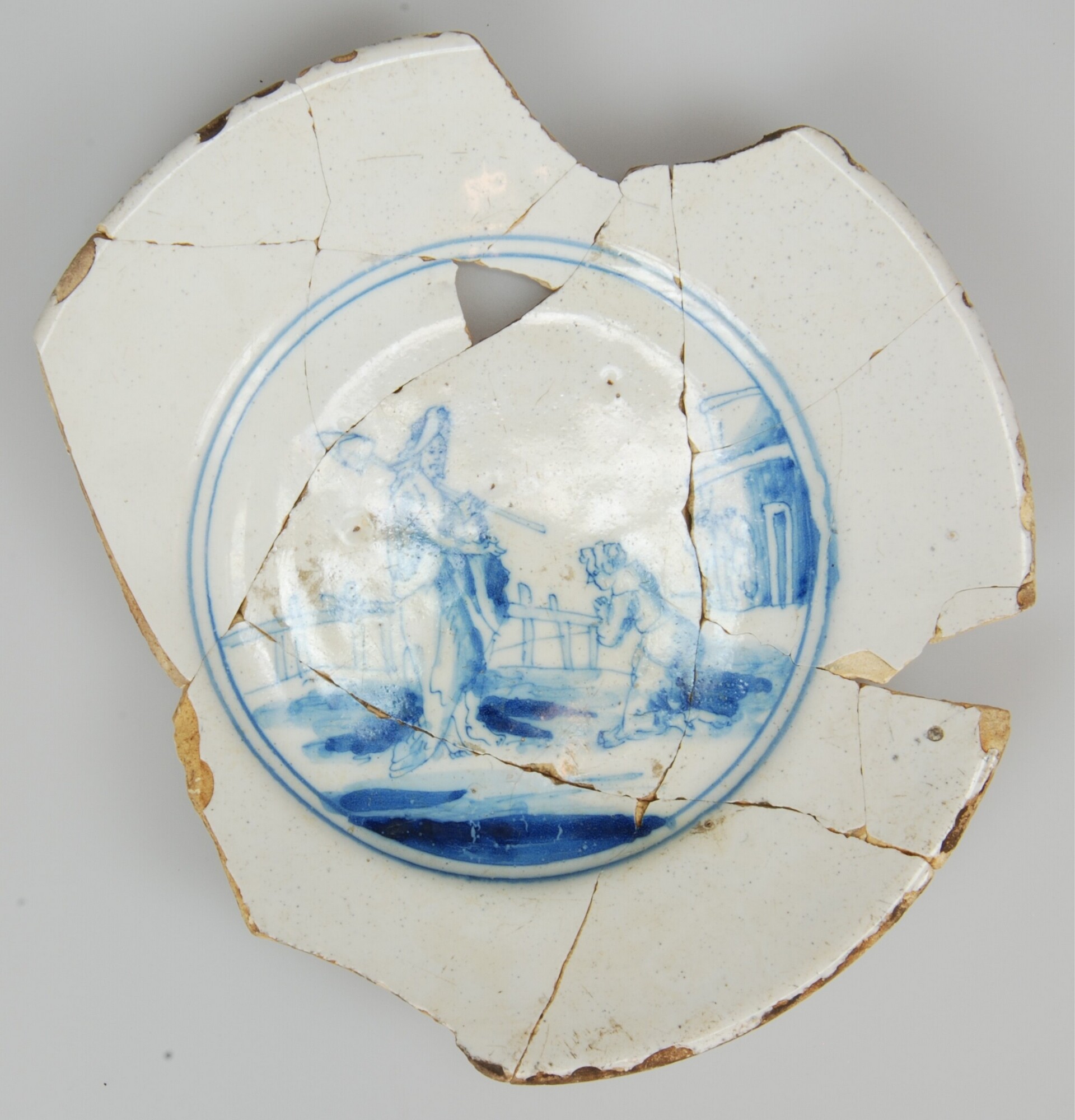 Bord; f-bor-2; bord met knik spiegel-vlag; Nederlandse faience; tinglazuur; blauwe beschildering; spiegel: personen in landschap (Bijbelscene); standvlak