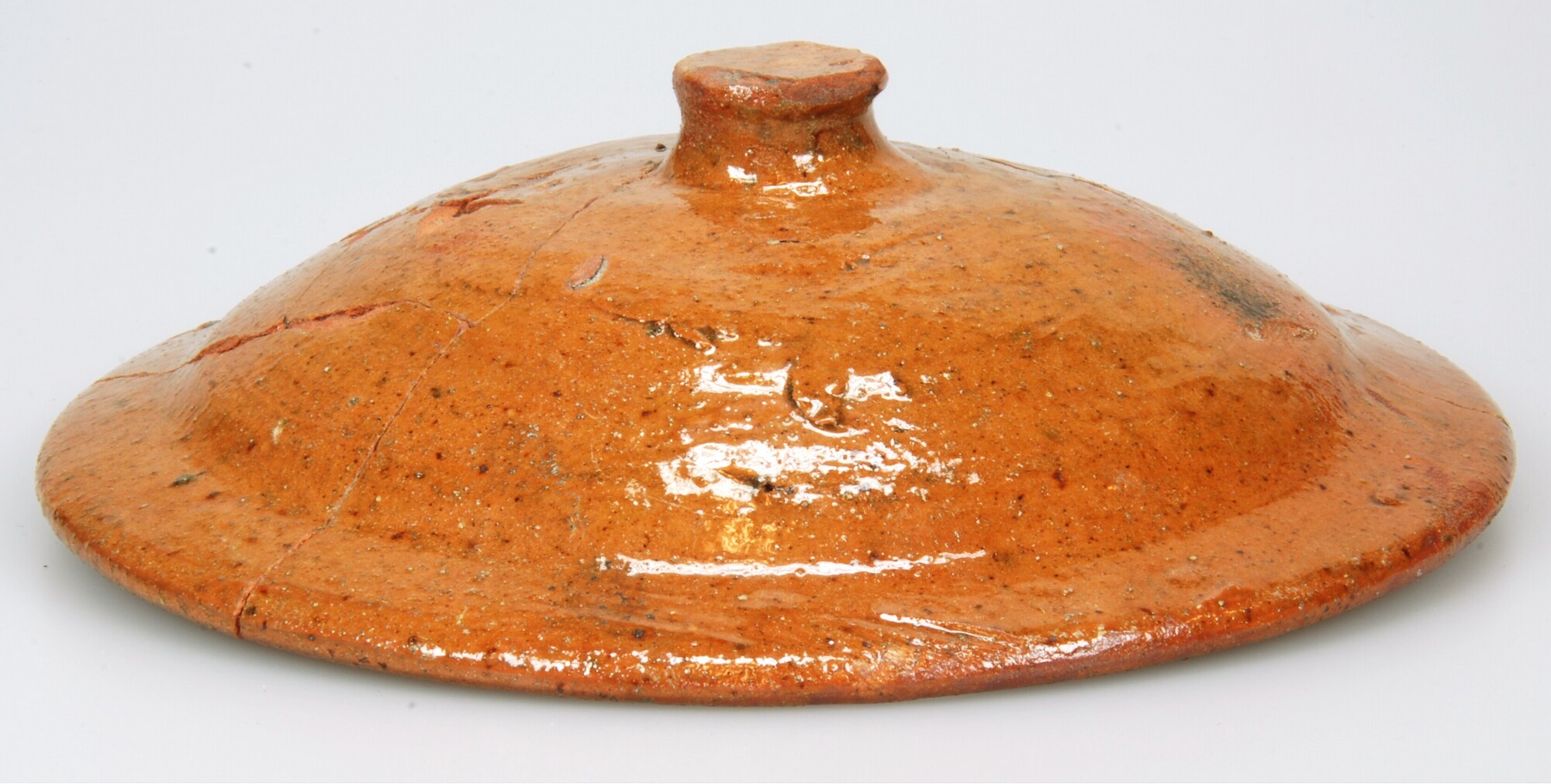 Deksel; r-dek-30; bolle deksel met knop en knik in wand; roodbakkend aardewerk; bovenzijdeloodglazuur; knop