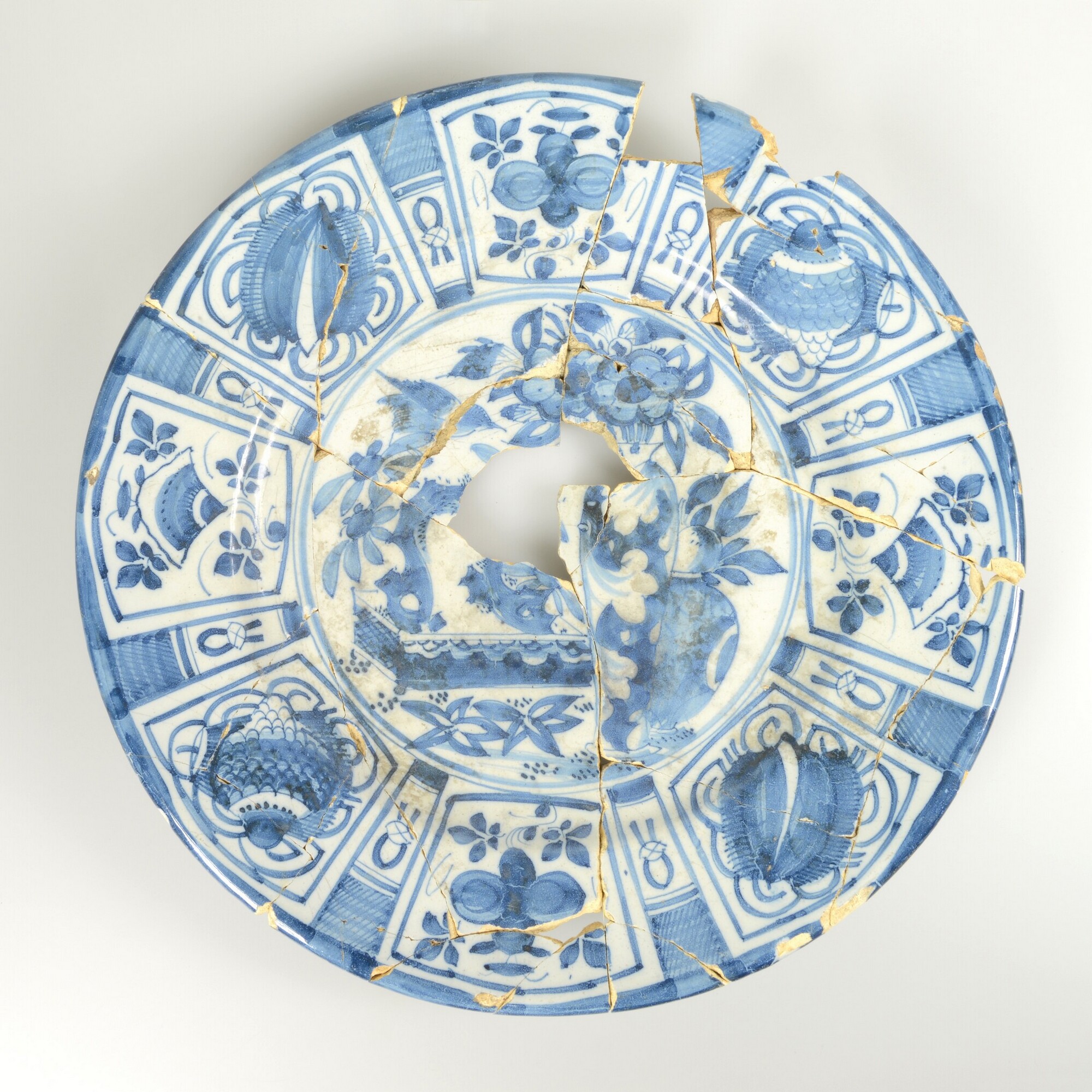 Bord; f-bor-1; bord met knik spiegel-vlag; faience; voor- en achterzijde tinglazuur; blauw op wit: spiegel: Chinese tuin, vlag: Wan-li decoratie, bloemen en symbolen in vakverdeling; standring (met twee secundaire doorboringen); herkomst: Delft
