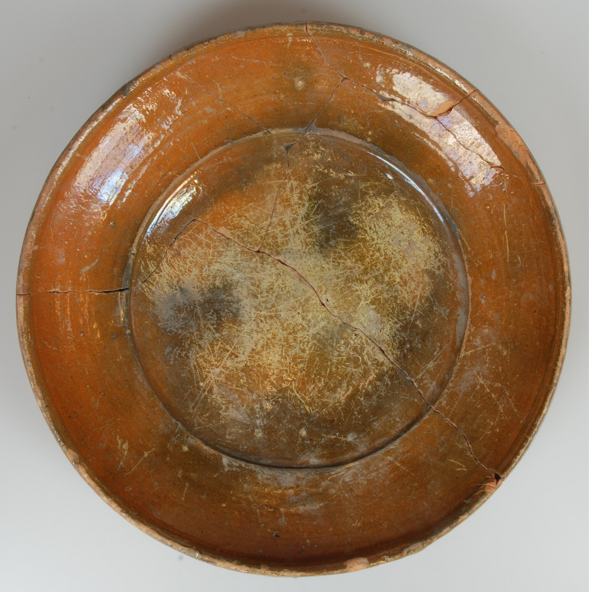 Bord; r-bor-50; groot bord met scherpe overgang tussen vlag en spiegel en verdikte rand; roodbakkend aardewerk; inwendig loodglazuur; drie standlobben; snijsporen op de spiegel; herkomst: Bergen op Zoom?