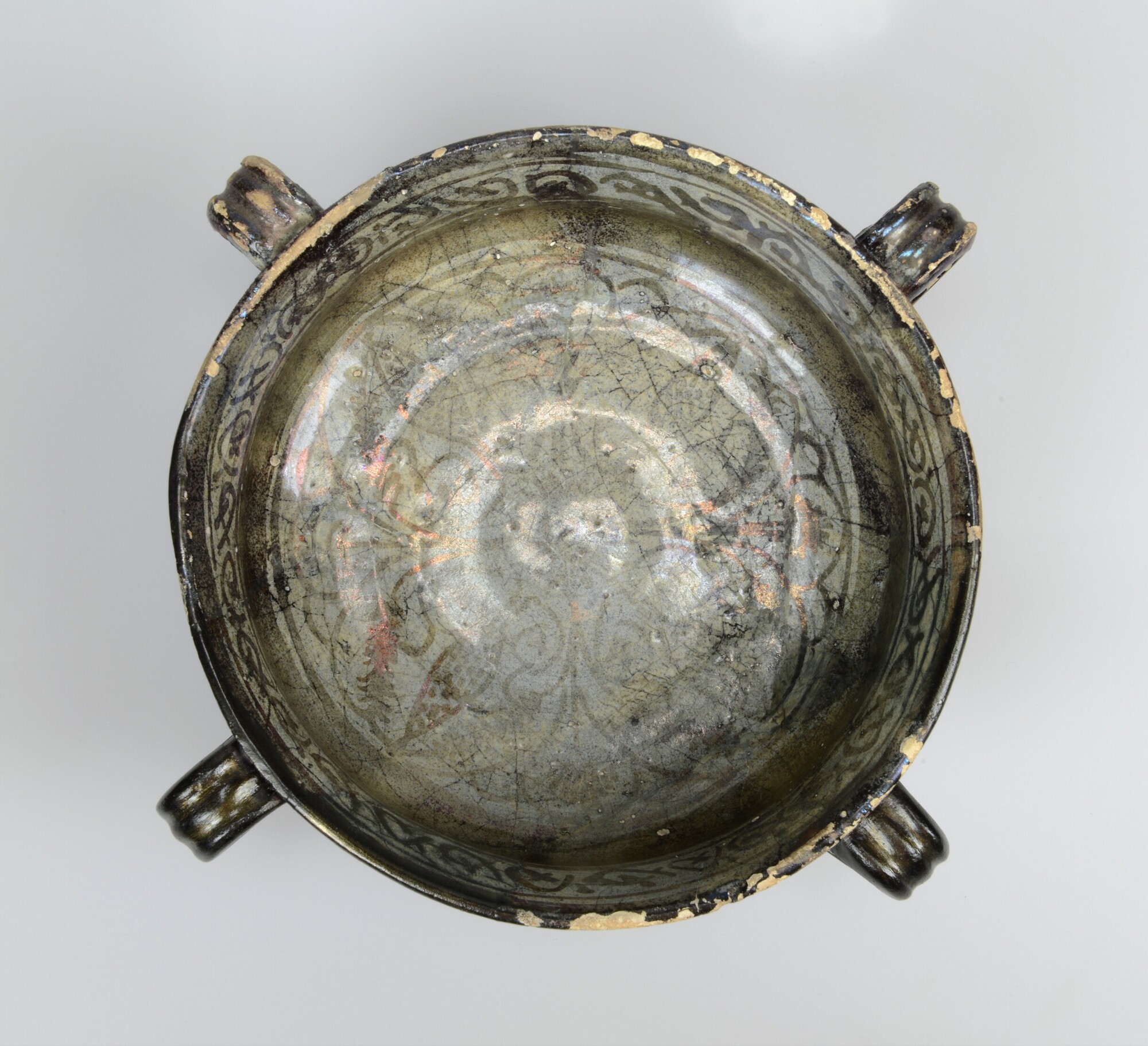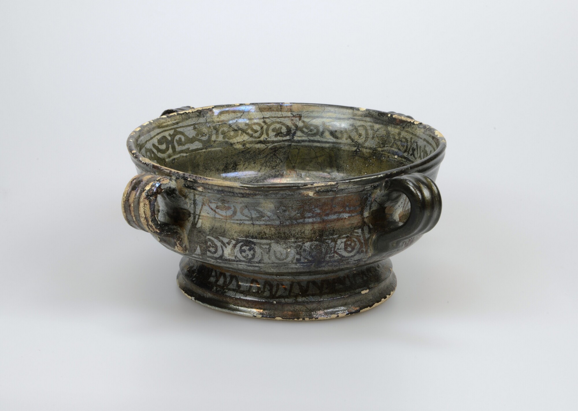 Kom / serveerkom; sp-kom-6; kom met knik in wand, hoge standring, vier verticale lintoren; Spaans tinglazuuraardewerk (goudlustermajolica): goudlusterbeschildering, inwendig: gestileerde levensboom en spiralen, uitwendig: spiralen, medaillons en zigzaglijnen; herkomst: Valencia (Manises?), Spanje