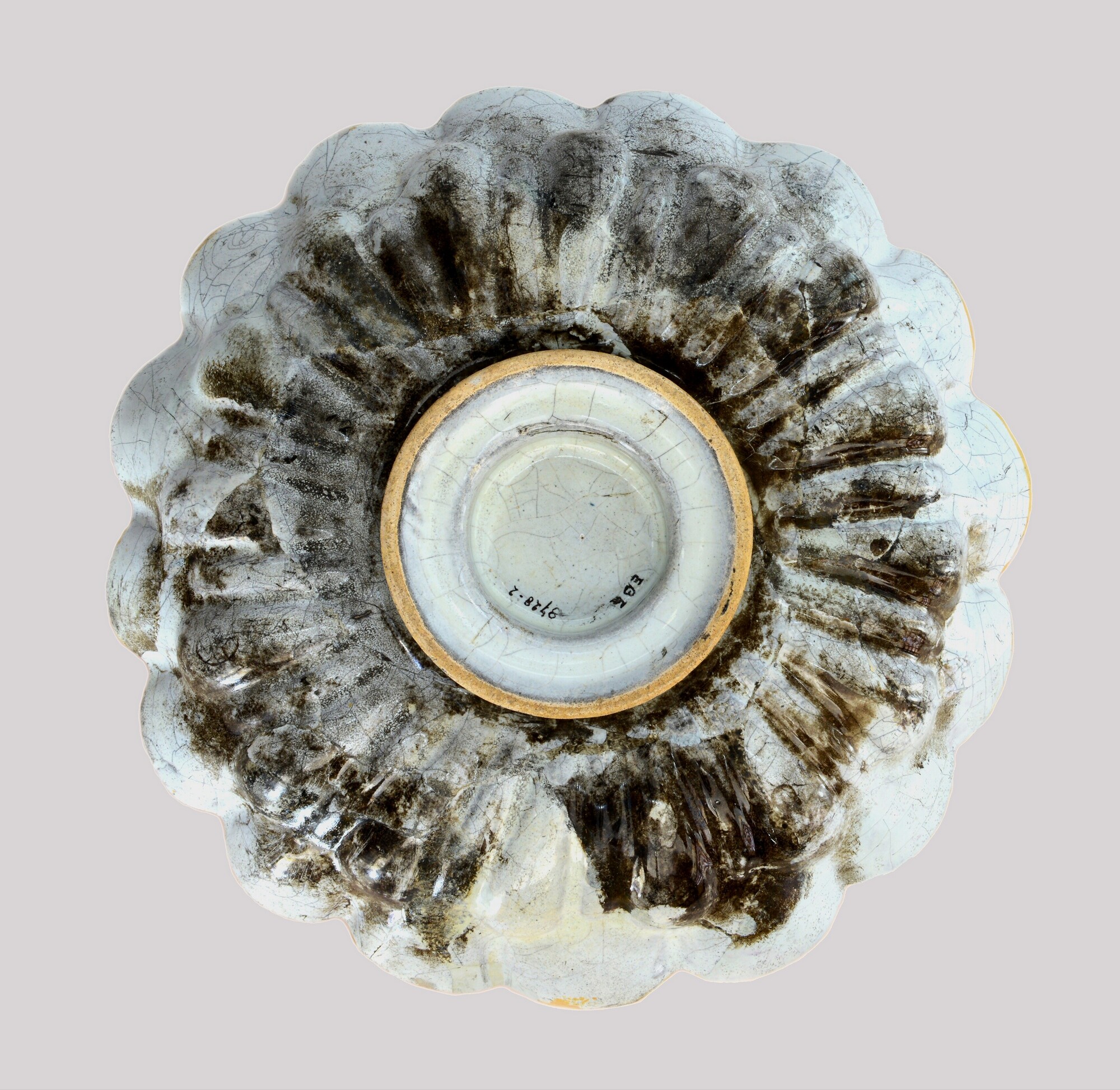 Plooischotel; f-plo-12; plooischotel met bolle spiegel en vlag met dubbele rij plooien, hoge standring; Nederlandse faience; tinglazuur; inwendig polychrome beschildering in de kleuren blauw, oker en mangaan op wit, spiegel: medaillon met staande putto met mantel op de rug en herdersstaf in de linkerhand; vlag: grotesken; bladertakken en fabelwezens met vrouwenkopjes en geitenkopjes, engelen met ...