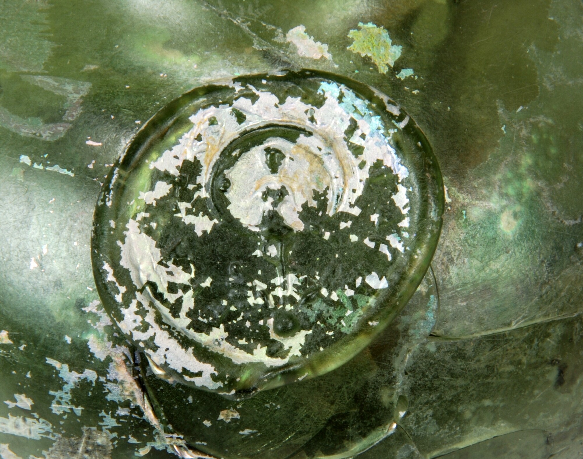 Fles; gl-fle-8; bolvormige fles met zeer lange hals, ronde buik, ronde draad ruim onder om de lip, opgestoken bodem met pontilmerk; groen glas; glaszegel op buik: Fortuna, randschrift: FRANTZ GONDELACH; herkomst: Sleeswijk-Holstein, Duitsland