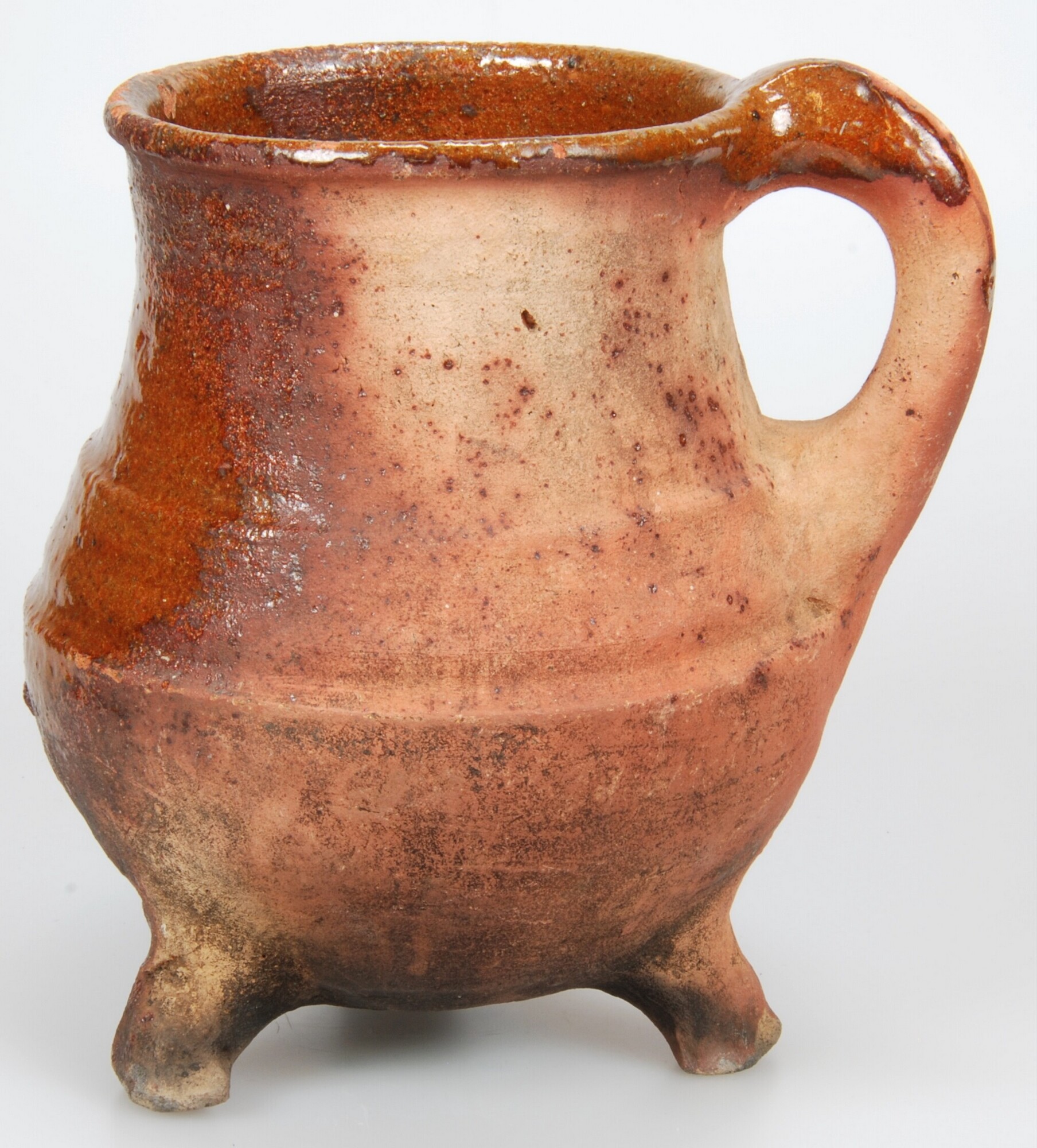 Grape; r-gra-41; hoge grape met scherpe buik-knik en rechte iets verdikte rand, drie poten, verticaal worstoor; roodbakkend aardewerk; inwendig spaarzaam loodglazuur, uitwendig loodglazuurvlek; bodem beroet; herkomst: West-Nederland