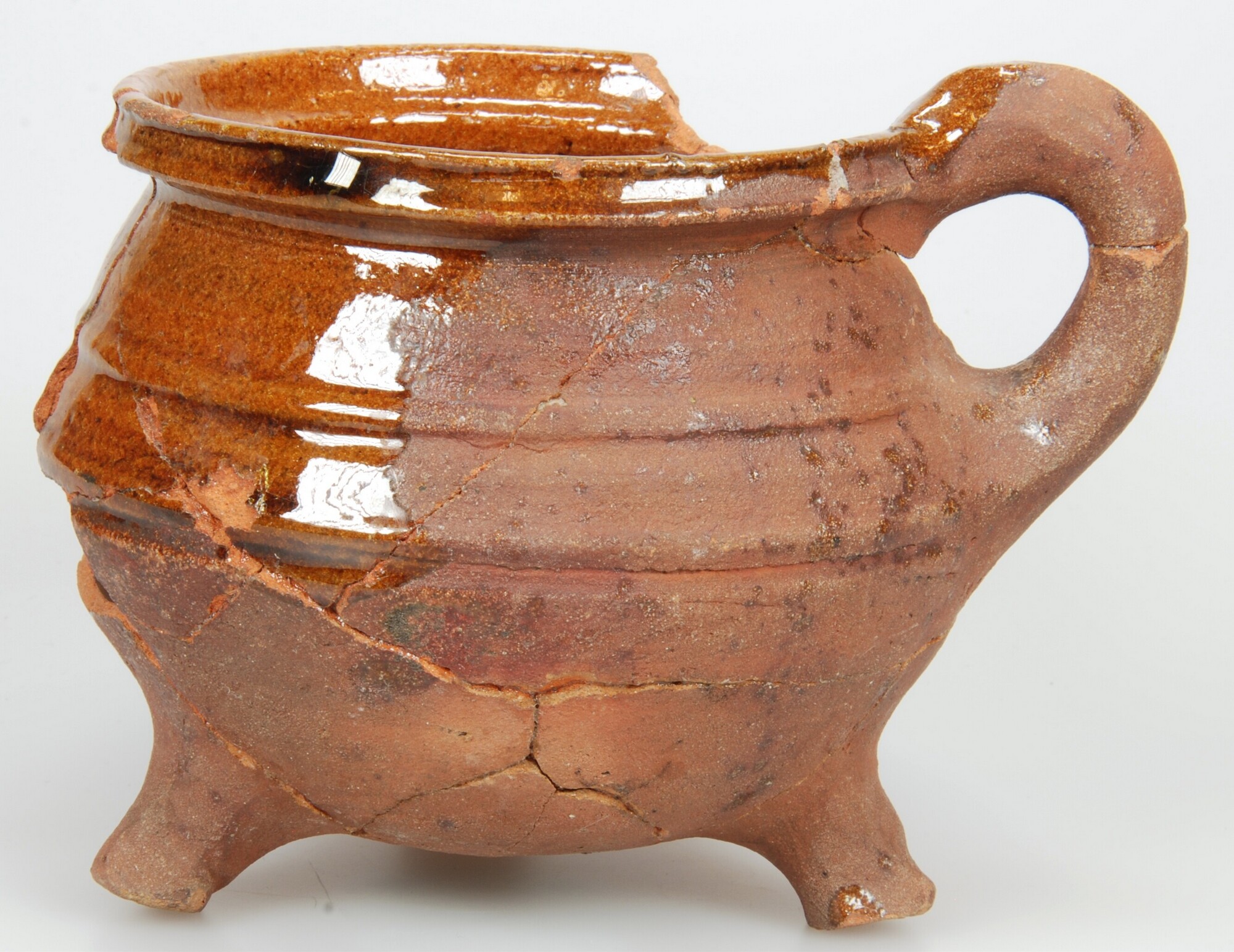 Grape; r-gra-34; grape met scherpe buikknik, ribbel op schouder en kraagrand; roodbakkend aardewerk; inwendig loodglazuur, uitwendig loodglazuurvlek; ribbel op schouder; drie poten; één worstoor