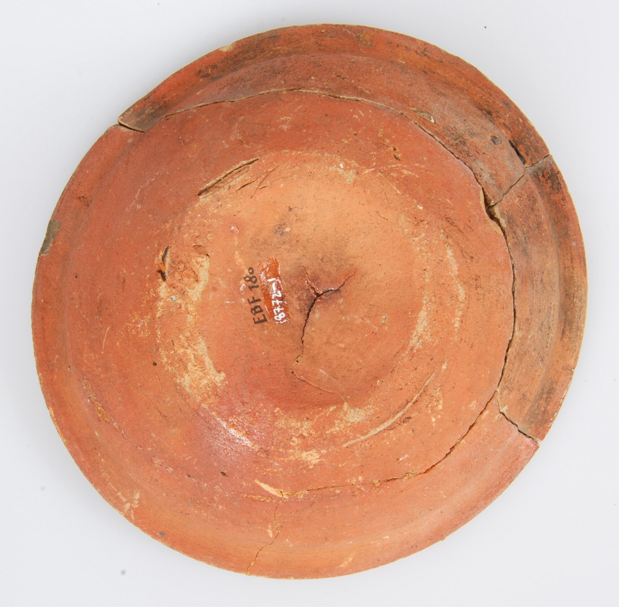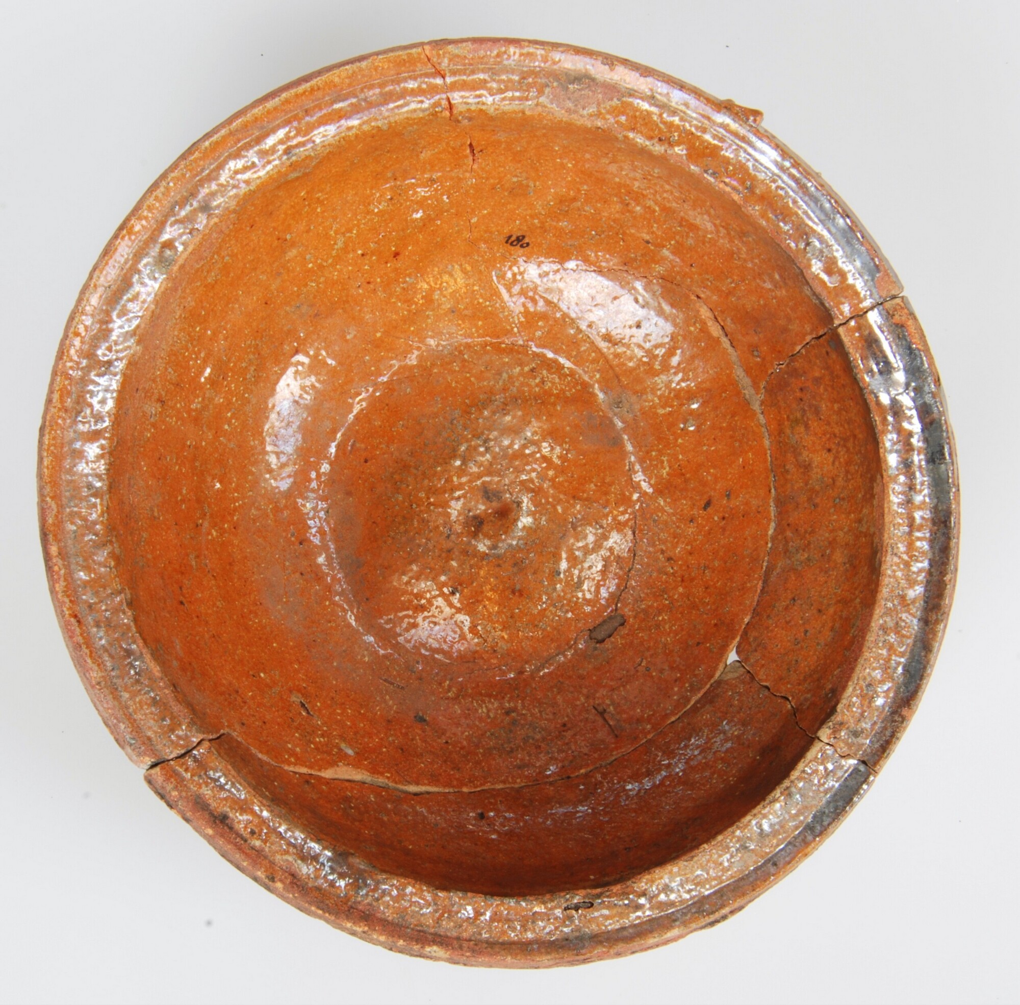 Kop; r-kop-22; kop met ingesnoerde rand, platte vlag en verdikte rand; roodbakkend aardewerk; inwendig loodglazuur; ziel