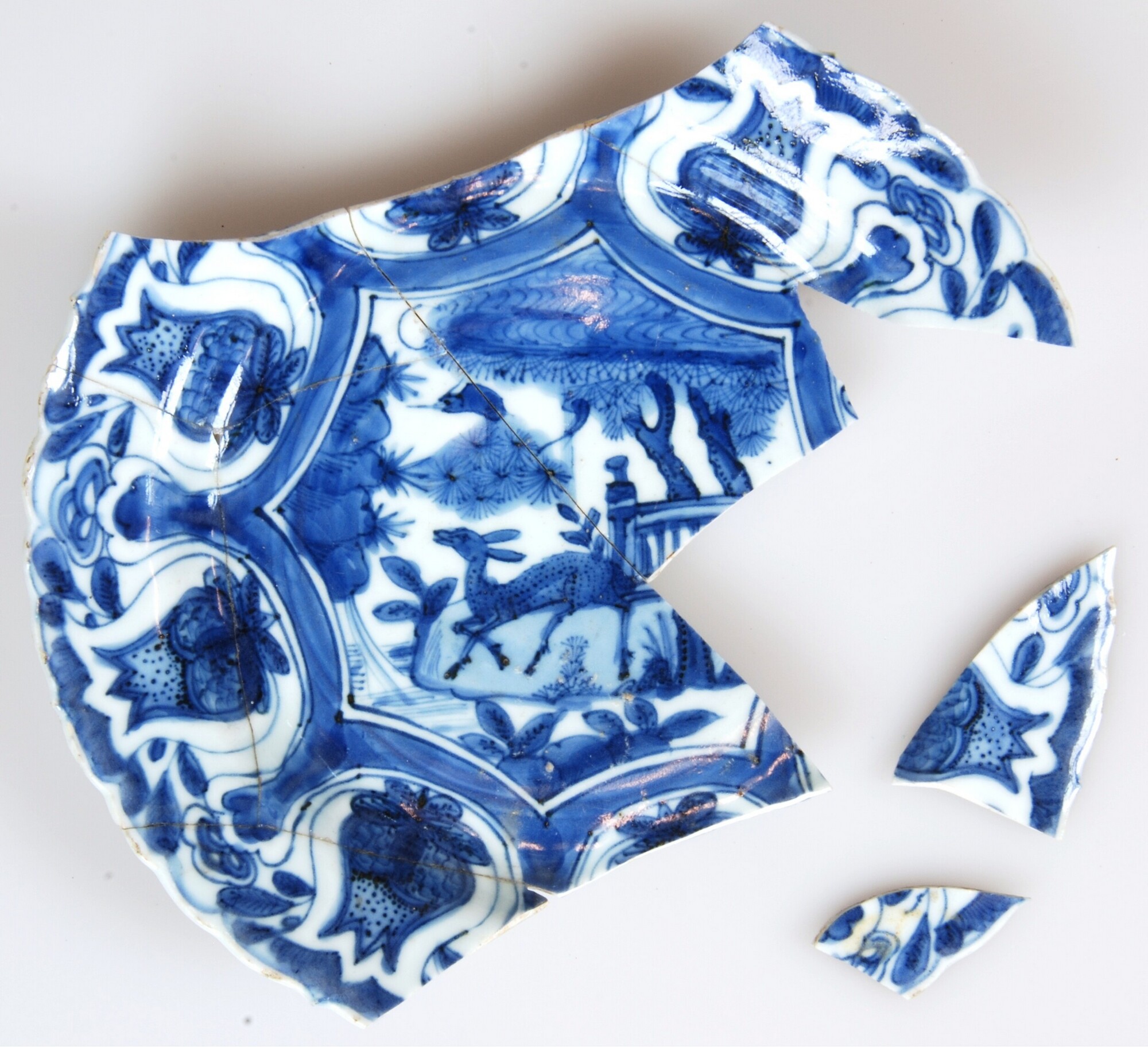 Bord; p-bor-4; bord met naar buiten geknikte vlag; porselein (kraakporselein); veldspaatglazuur; blauwe beschildering; spiegel: hert in landschap; vlag: granaatappels; achterzijde: bogen en stippen; standring; doorboring in standring; herkomst: China (Wanli-periode)