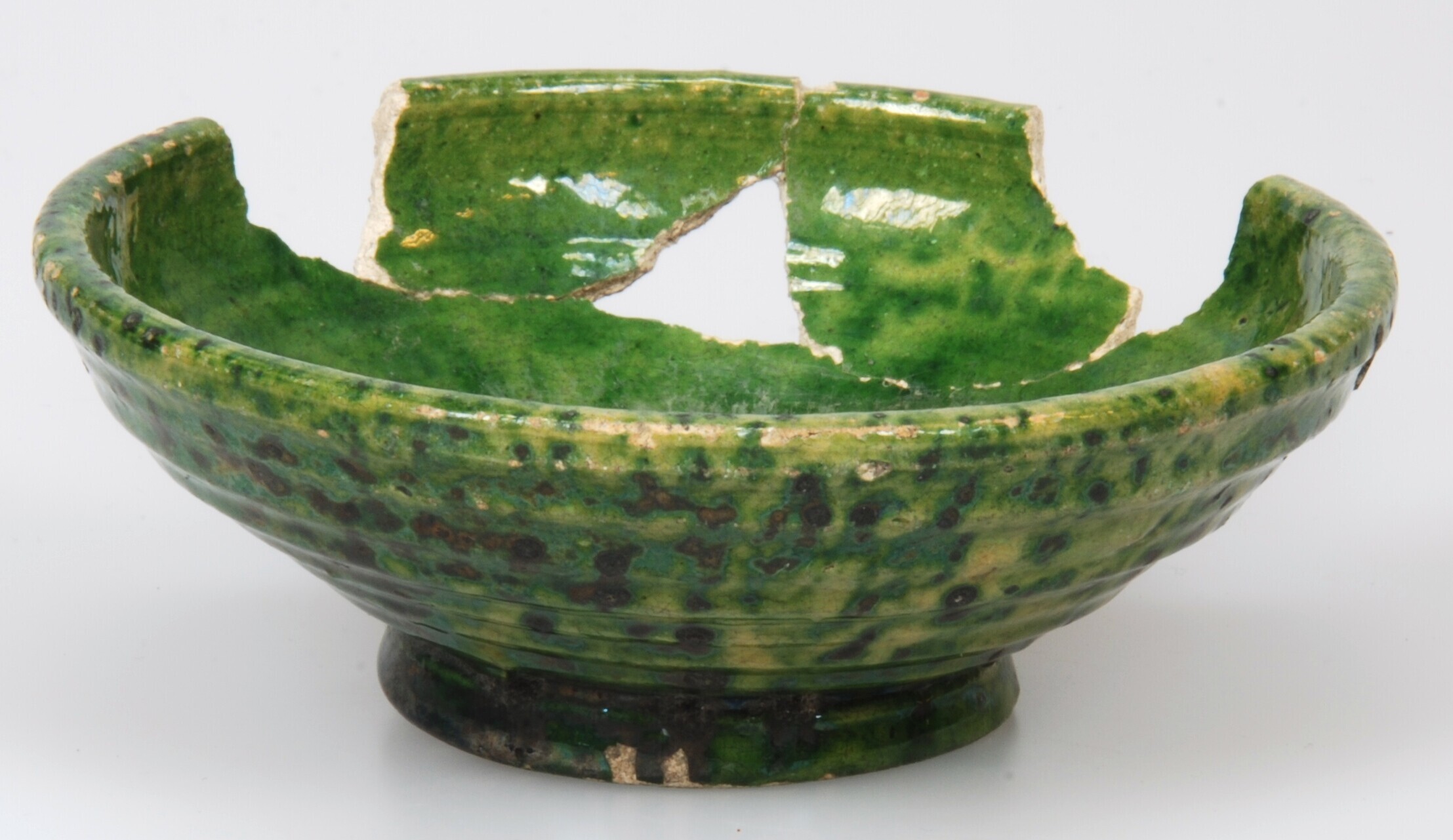 Kop; w-kop-26; kop met iets naar binnen gebogen rand; witbakkend aardewerk; in- en uitwendig loodglazuur met koperoxide; standvlak