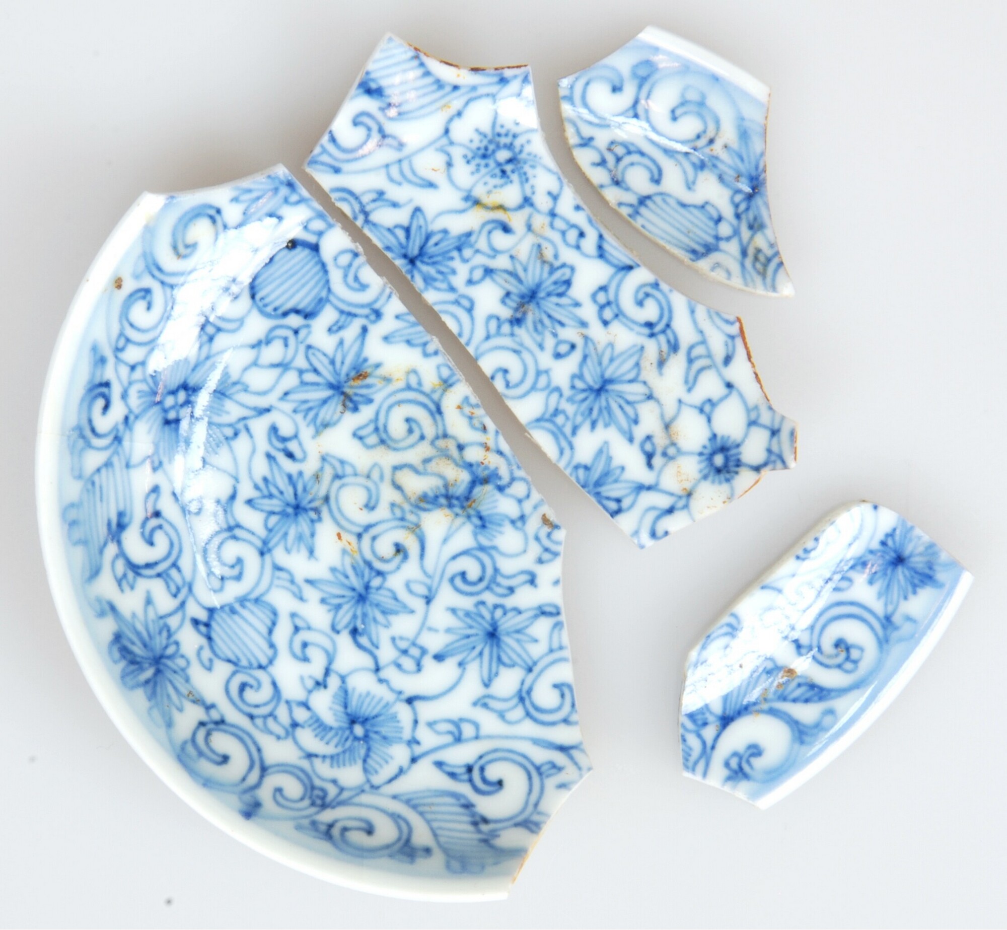 Bord; p-bor-1; bord met iets uitgebogen rand; porselein; veldspaatglazuur; blauwe beschildering: inwendig: florale motieven; standring; herkomst: China (Kangxi-periode)