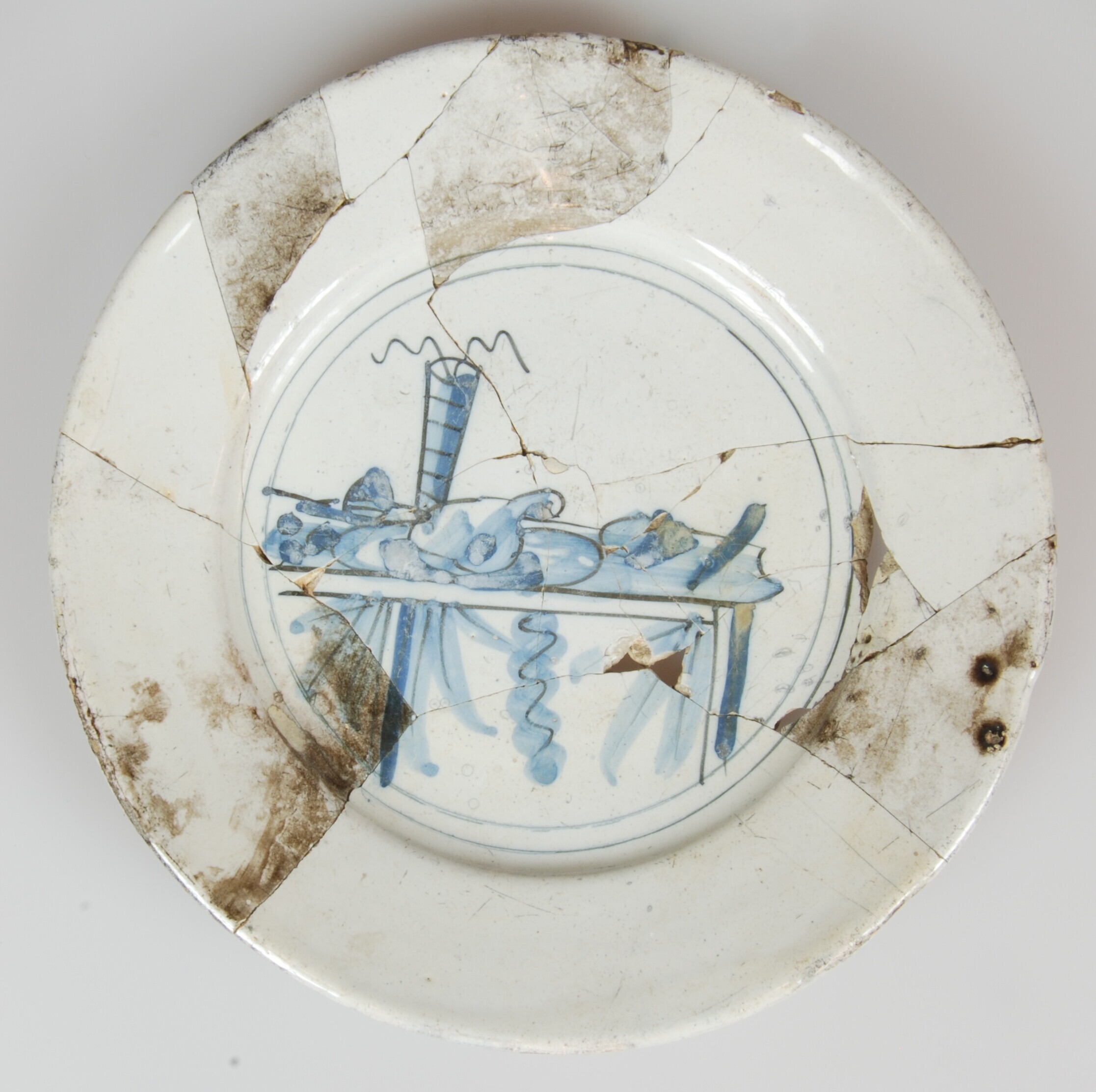 Bord; f-bor-2; bord met knik spiegel-vlag, standvlak; Nederlandse faience; tinglazuur; inwendig blauwe beschildering: spiegel: gedekte tafel binnen dubbele cirkel; herkomst: vermoedelijk Delft