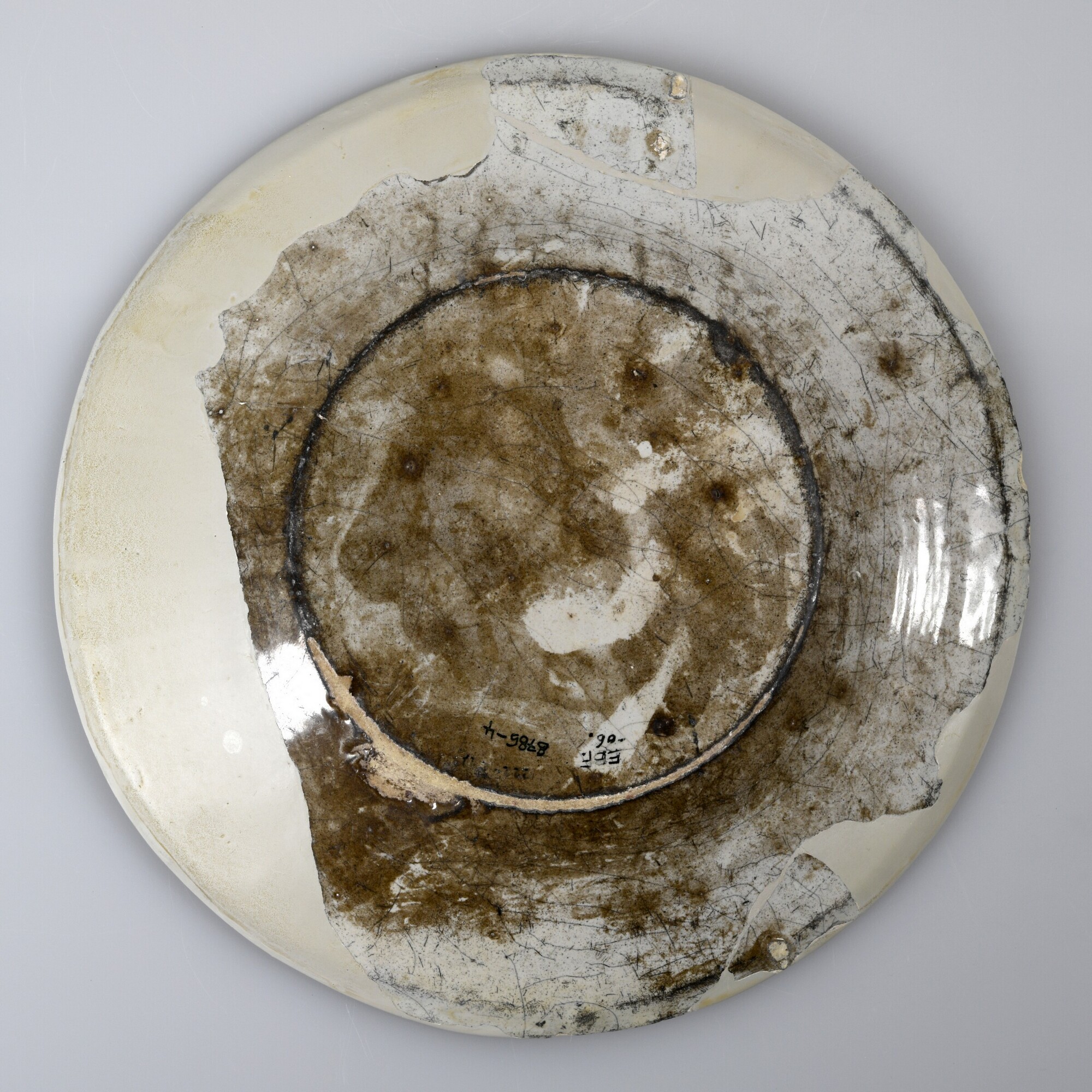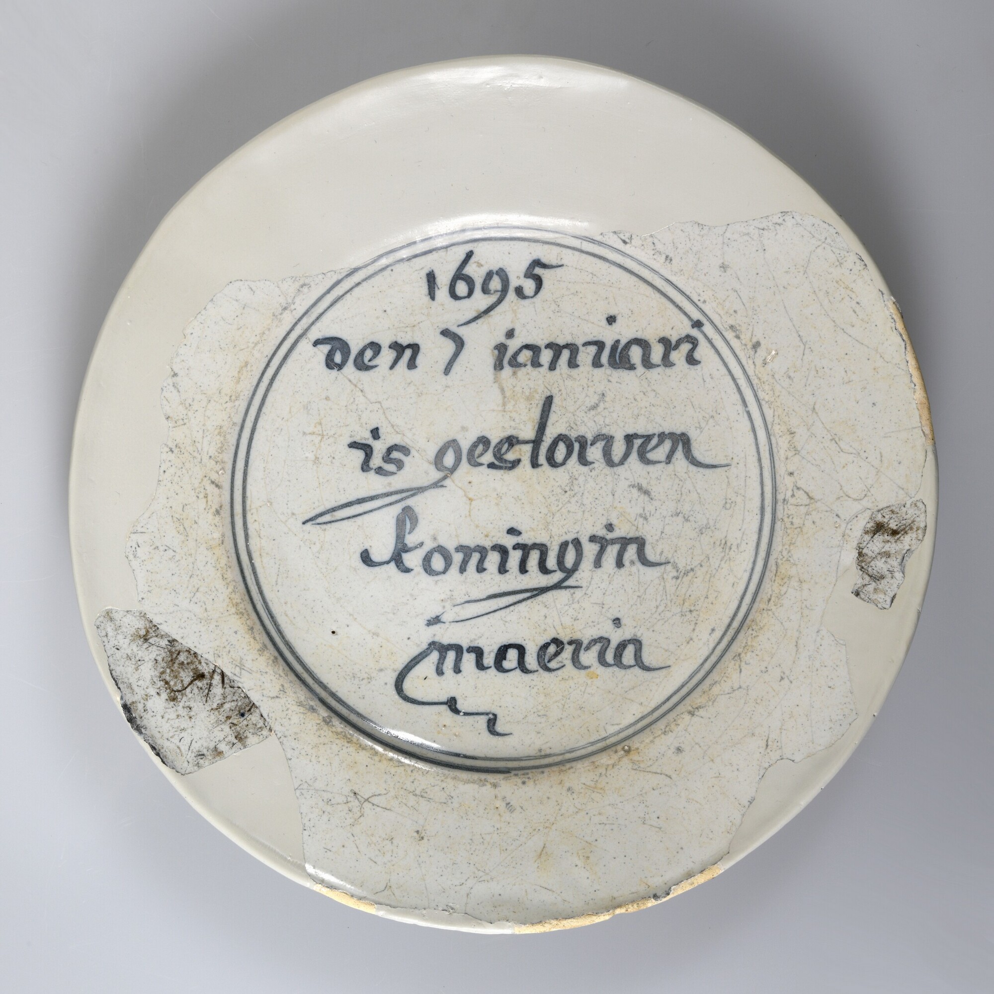 Bord; f-bor-2; plat bord met platte spiegel, platte vlag inwendig met knik afgezet, standvlak; Nederlandse faience; tinglazuur; blauwe beschildering; spiegel: tekst '1695 den 7 ianuari is gestorven koningin Maeria' binnen dubbele cirkel; de tekst verwijst naar Queen Mary, de gemalin van Willem III van Oranje; herkomst: Delft