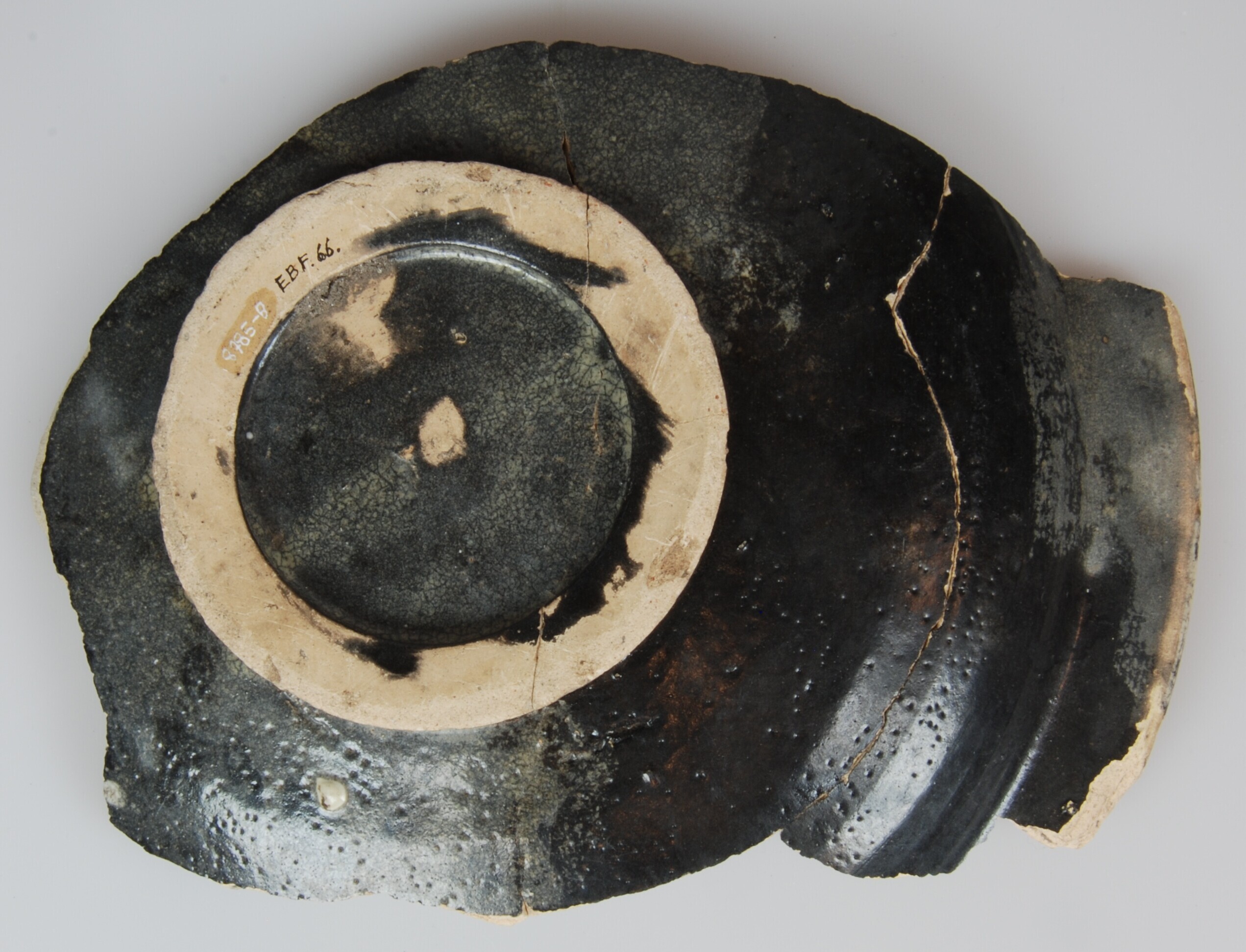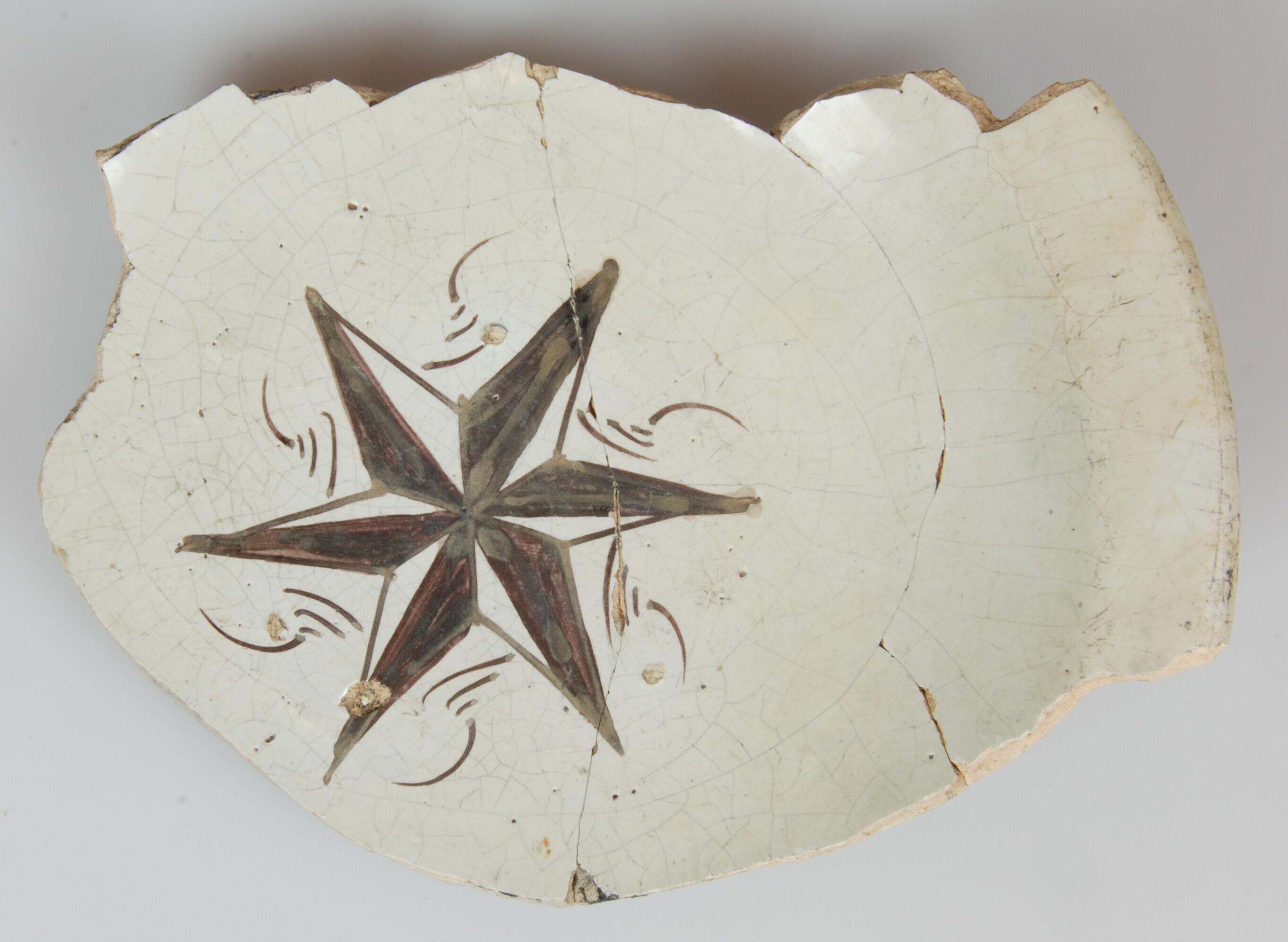 Bord; m-bor-12; diep bord met uitgebogen vlag; Nederlandse majolica; bovenzijde tinglazuur, onderzijde loodglazuur; paarse beschildering; spiegel: zespuntige ster; herkomst: Friesland (?)