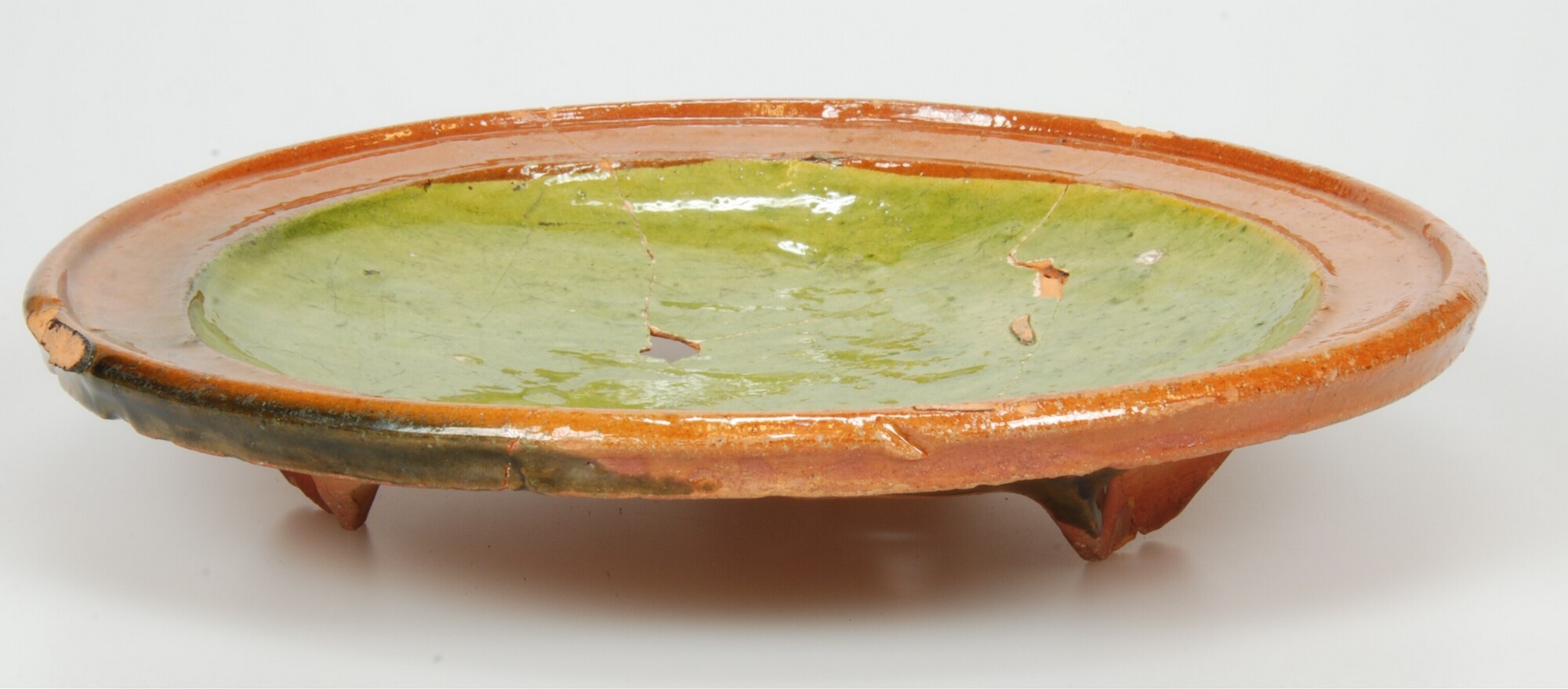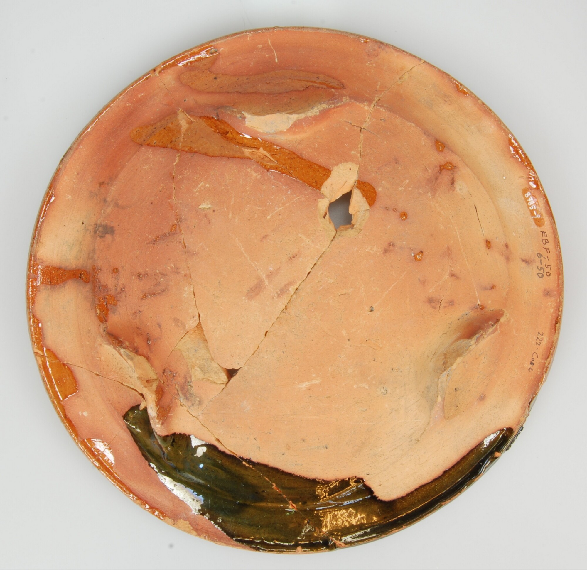Bord; r-bor-6; bord met holle spiegel en korte platte vlag; roodbakkend aardewerk; inwendig loodglazuur; op spiegel witte slib met loodglazuur en koperoxide; drie standlobben