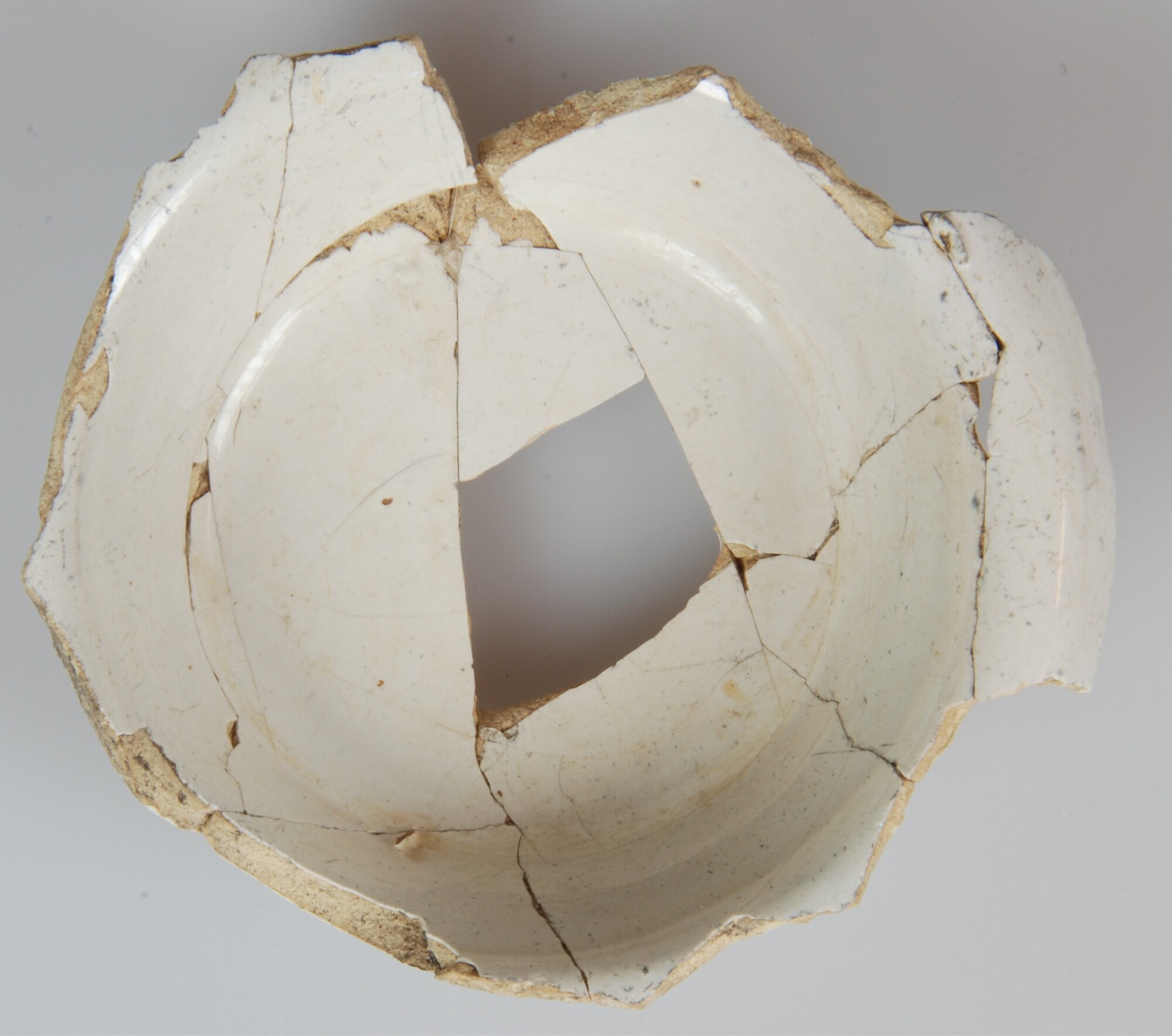 Kom; f-kom-3; afgeronde kom met uitgebogen rand; Nederlandse faience; tinglazuur; geheel wit; standring; herkomst: Delft