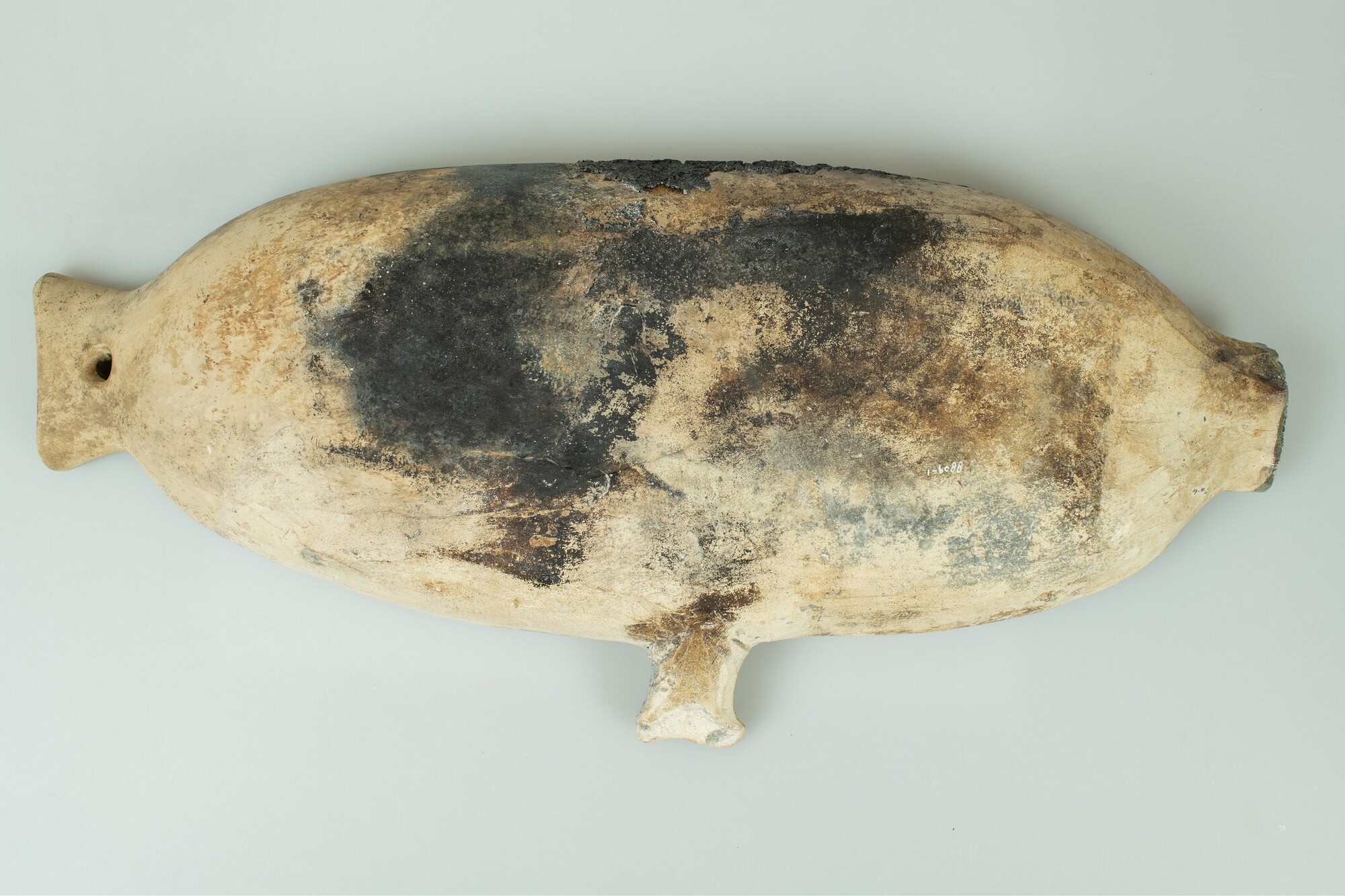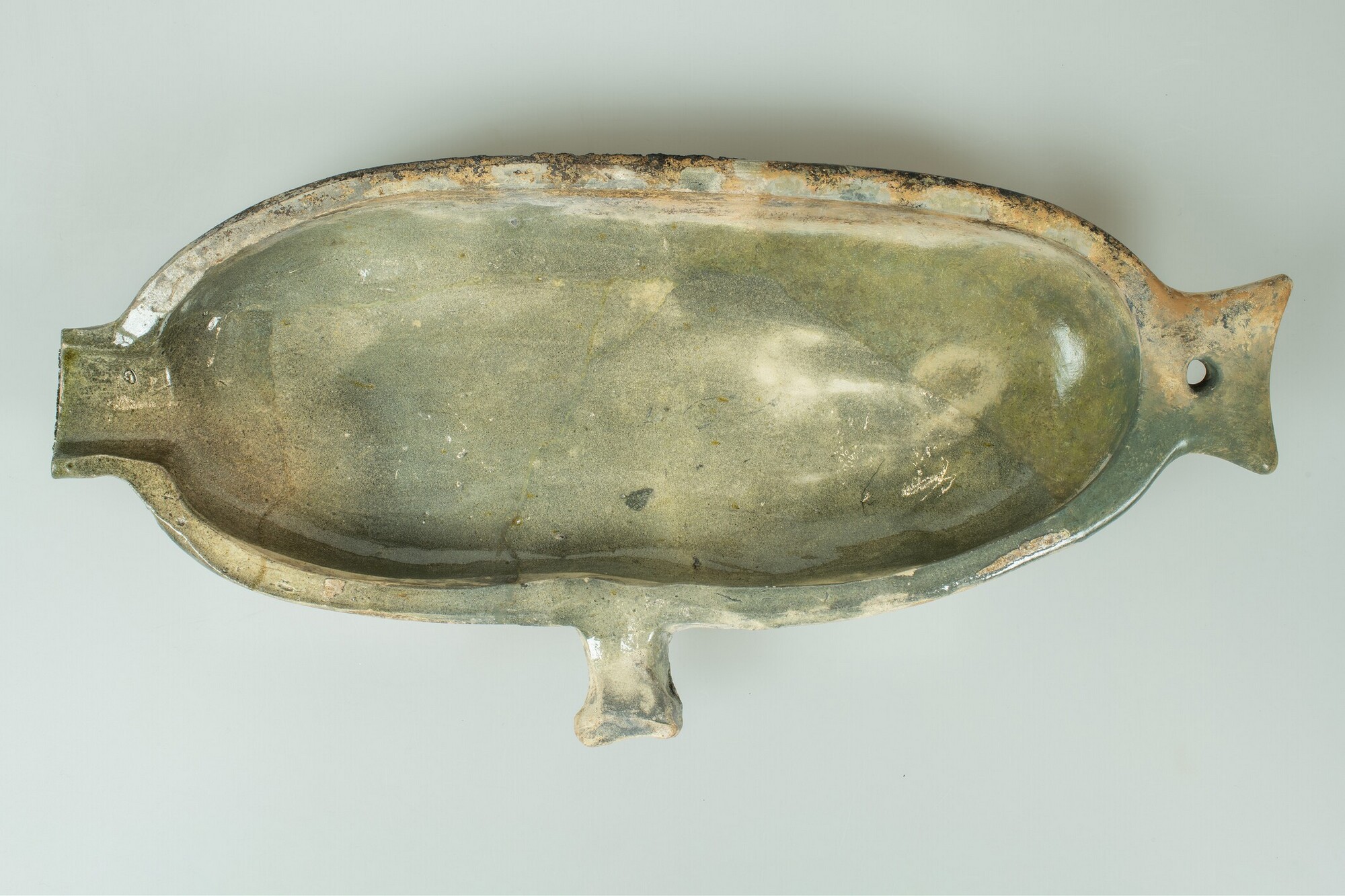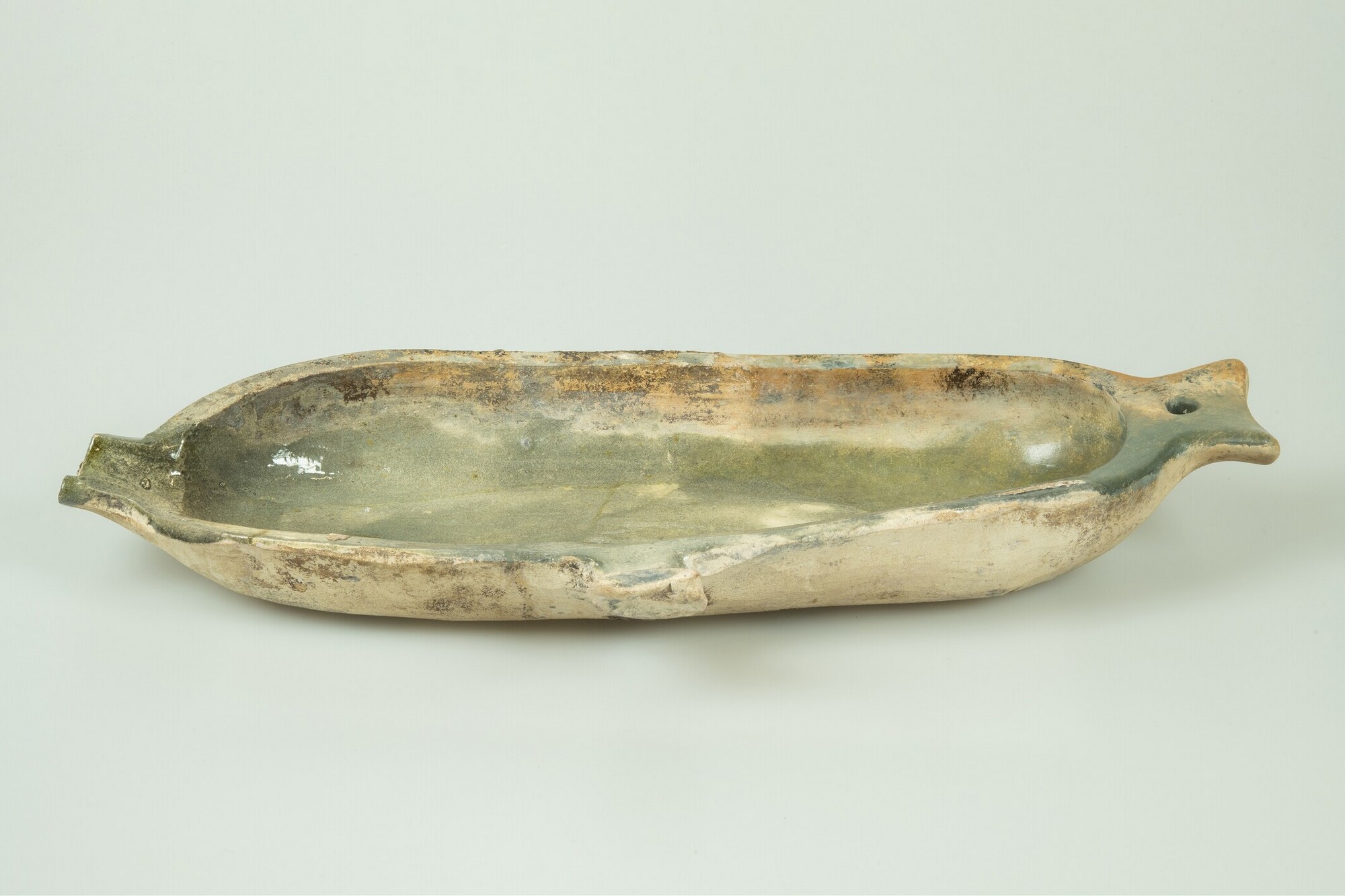 Vetvanger; ha-vet-2; ovale vetvanger met rechte rand, standvlak, schenklip op lange zijde en steel op korte zijde; rechthoekig ophangoog (reconstructie); witbakkend Hafnerwaar; inwendig loodglazuur met groenige waas; roetsporen buitenzijde; productieplaats: Keulen, Rijnland
