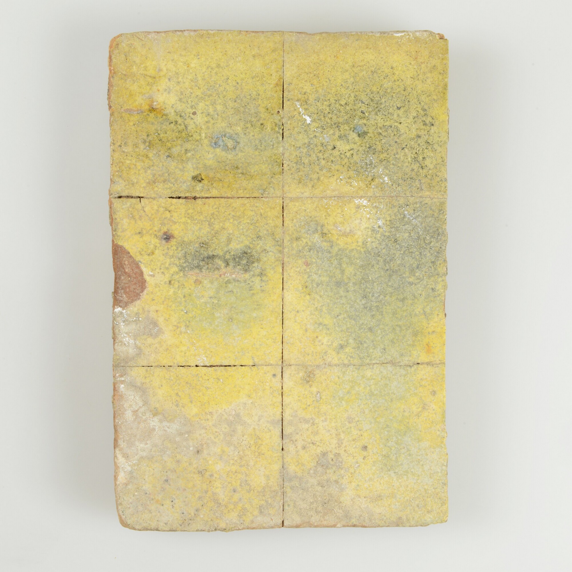 Plavuis; roodbakkend aardewerk; bovenzijde witte kleisliblaag met loodglazuur; ingeritst in zes vlakken; mortelresten op het oppervlak; herkomst: Utrecht; vondstomstandigheden: opgraving NJBG 1971-1972