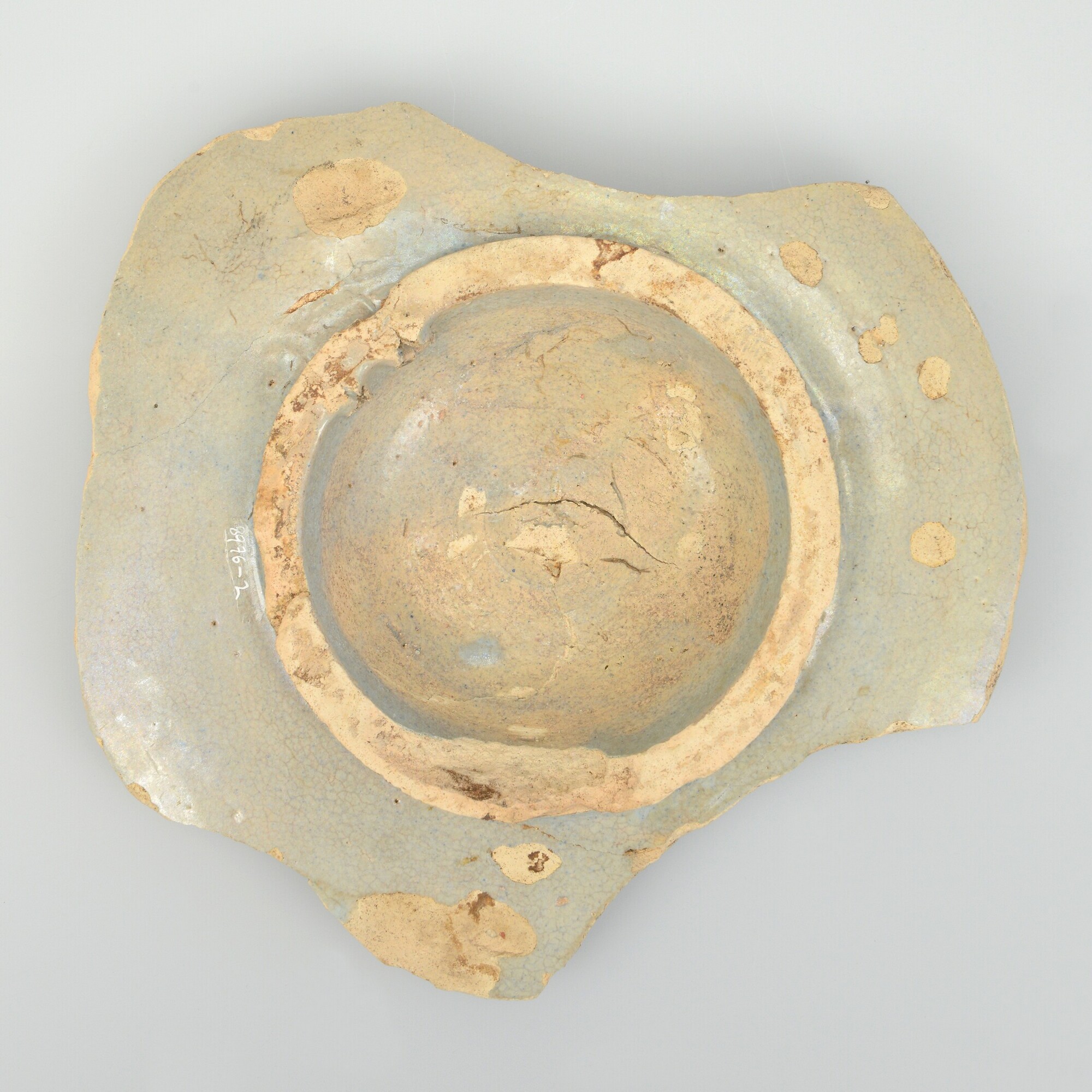 Bord; m-bor-?; majolica; inwendig tinglazuur, uitwendig loodglazuur; bord met bolle spiegel; standring; op spiegel blauw/gele beschildering: schaakbordmotief