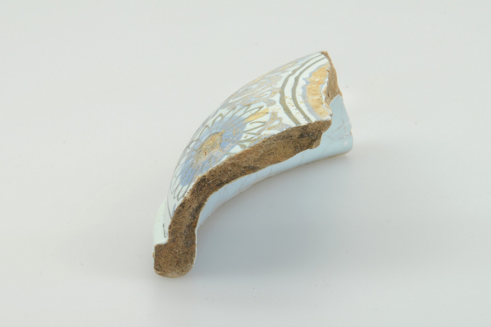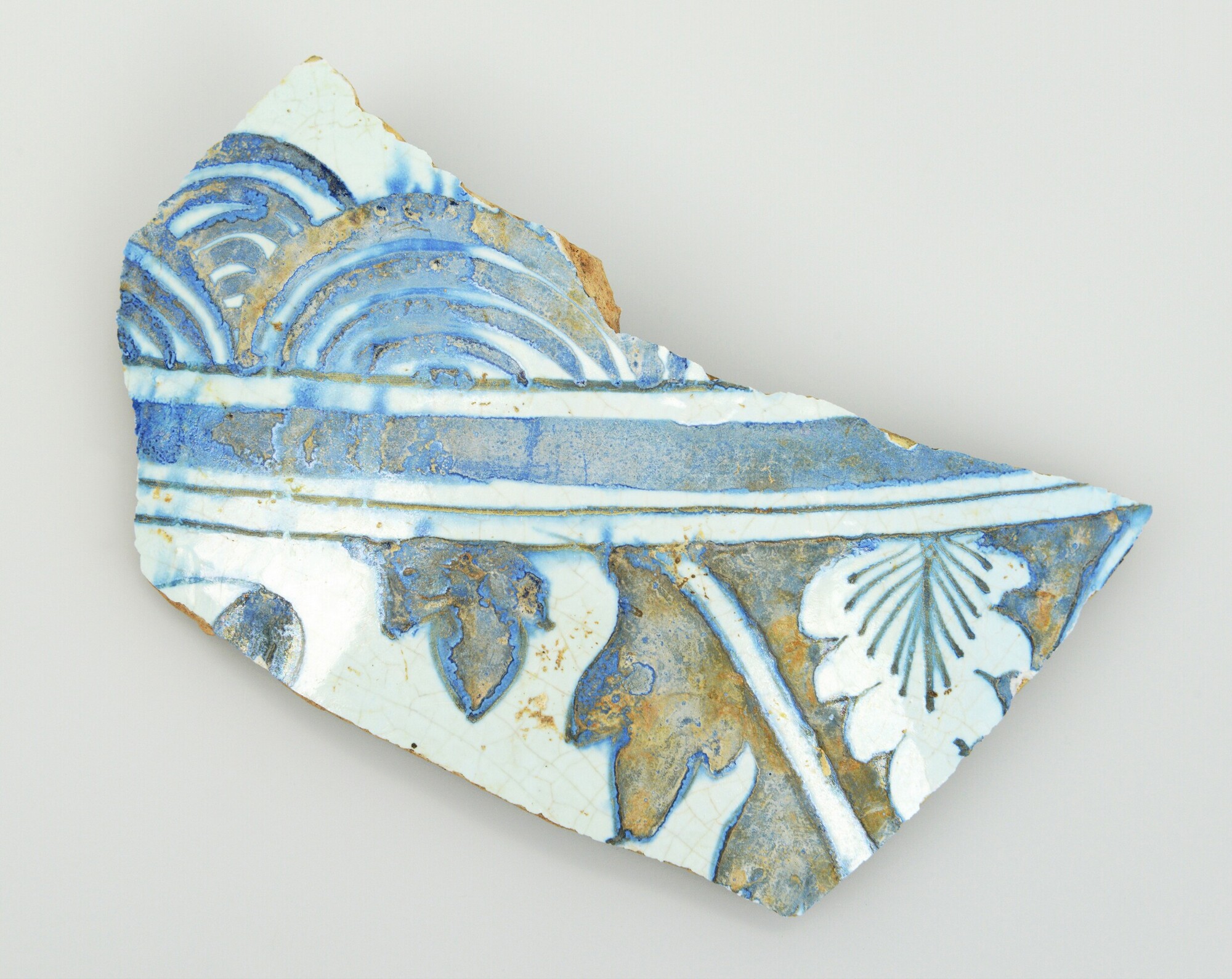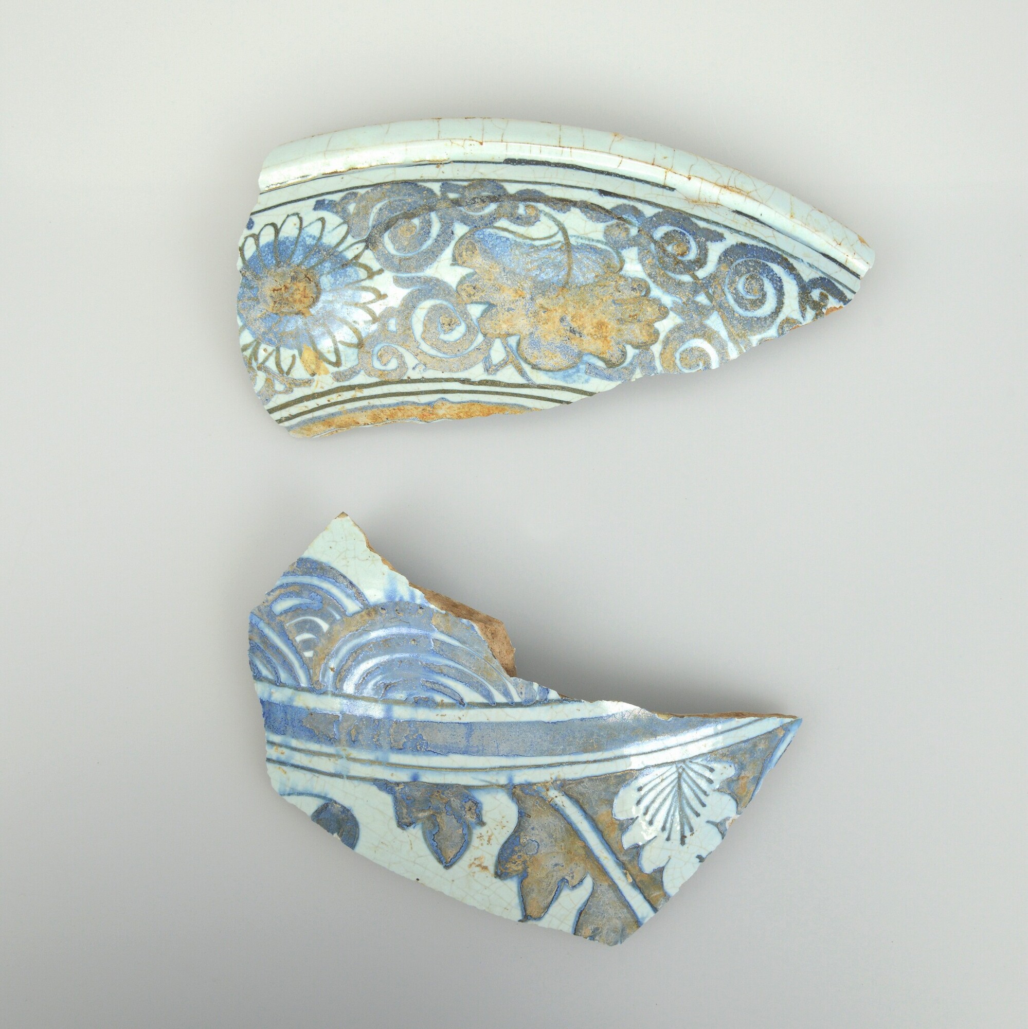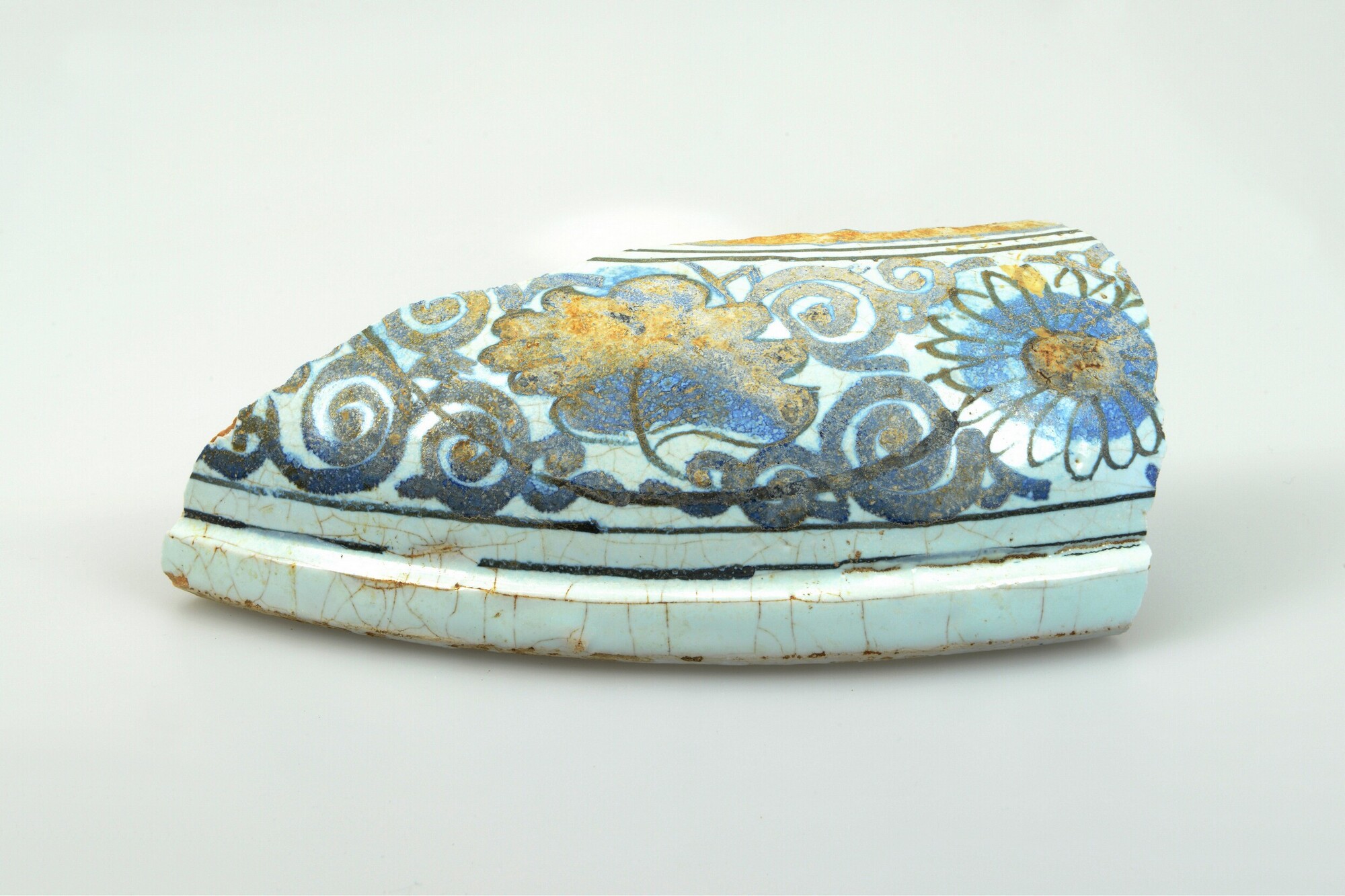 Bloempot/tuinvaas; f-blo-?; wandfragment en fragment van standvoet van groot formaat bloempot; faience; tinglazuur; blauwe beschildering: florale motieven