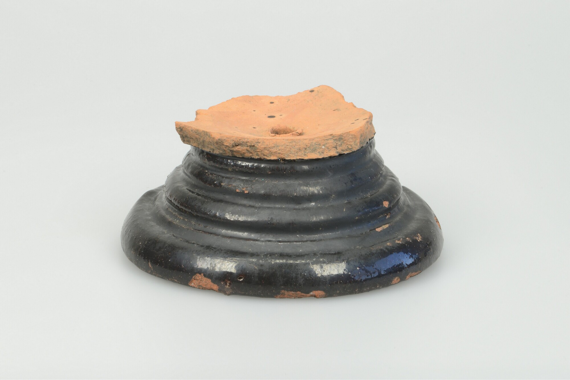Bloempot; r-blo-?; roodbakkend; loodglazuur/mangaan; fragment van bodem/standring; doorboring in bodem