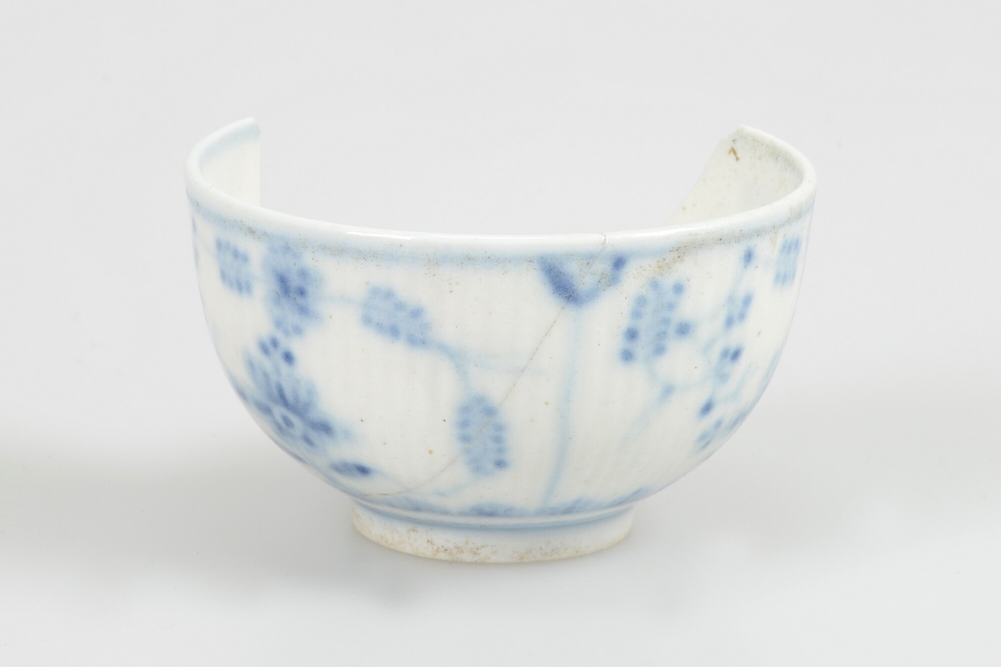 Kop; ep-kop-8; afgeronde kop met rechte rand; Europees porselein; Loosdrecht; veldspaatglazuur; monochroom, blauw: Zwiebelmuster; merkteken en ingekraste tekens: L35