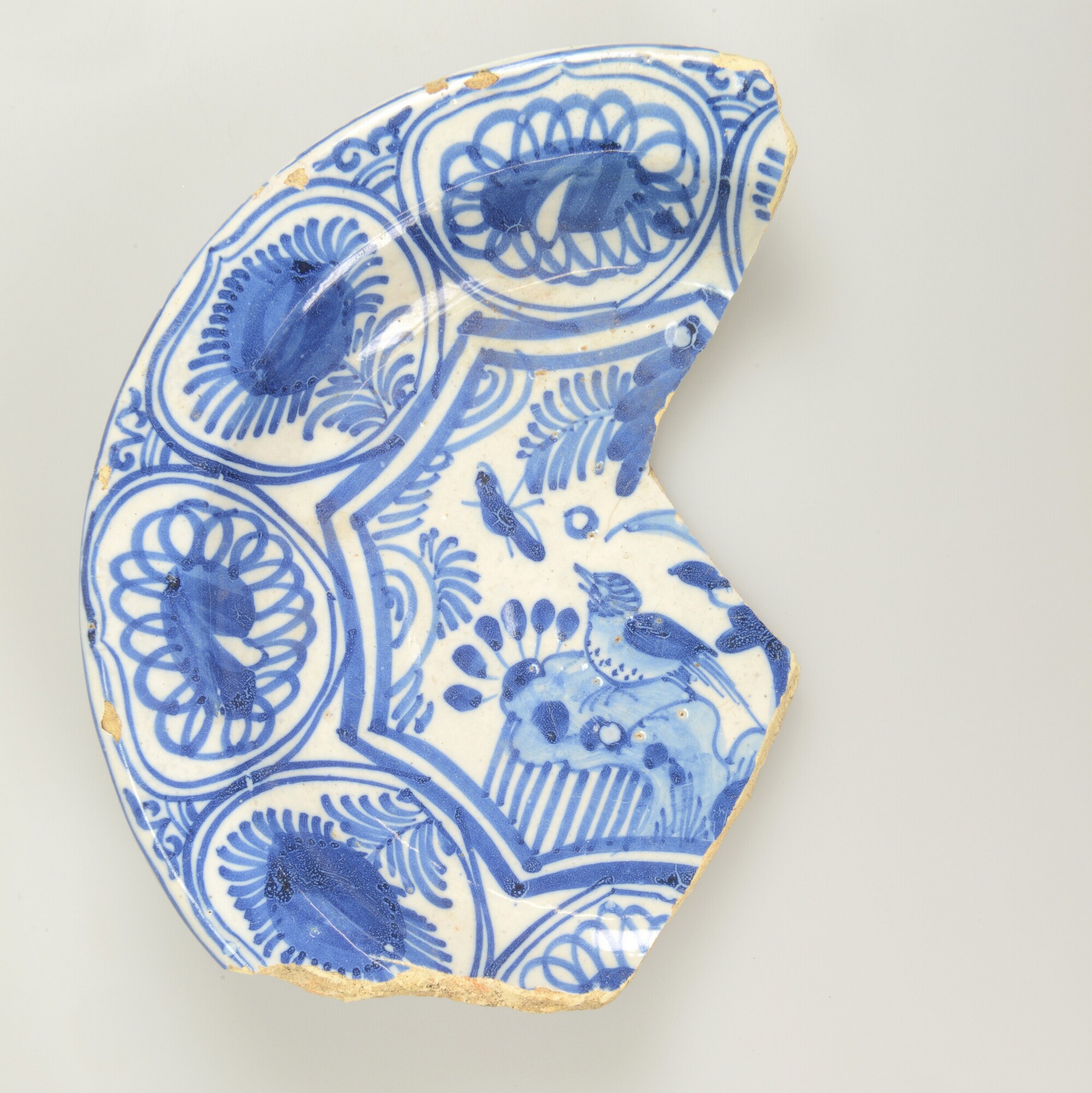 Bord; f-bor-10; bord met knik spiegel-vlag; Nederlandse faience; tinglazuur; decoratie in kobaltoxide (blauw), sp: Chinese tuin, vl: vakkenindeling in ovalen met Wan-li decoratie; standring